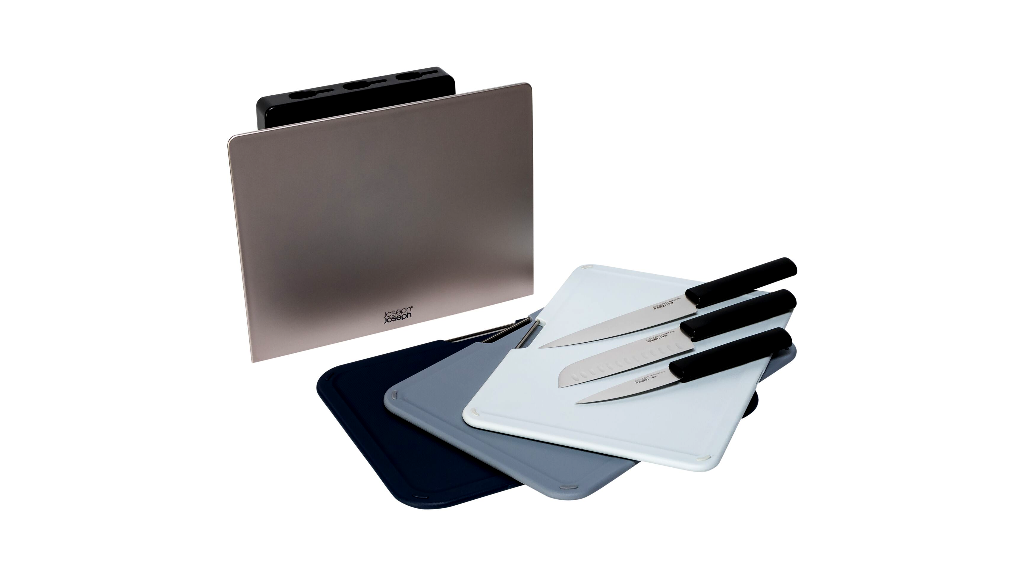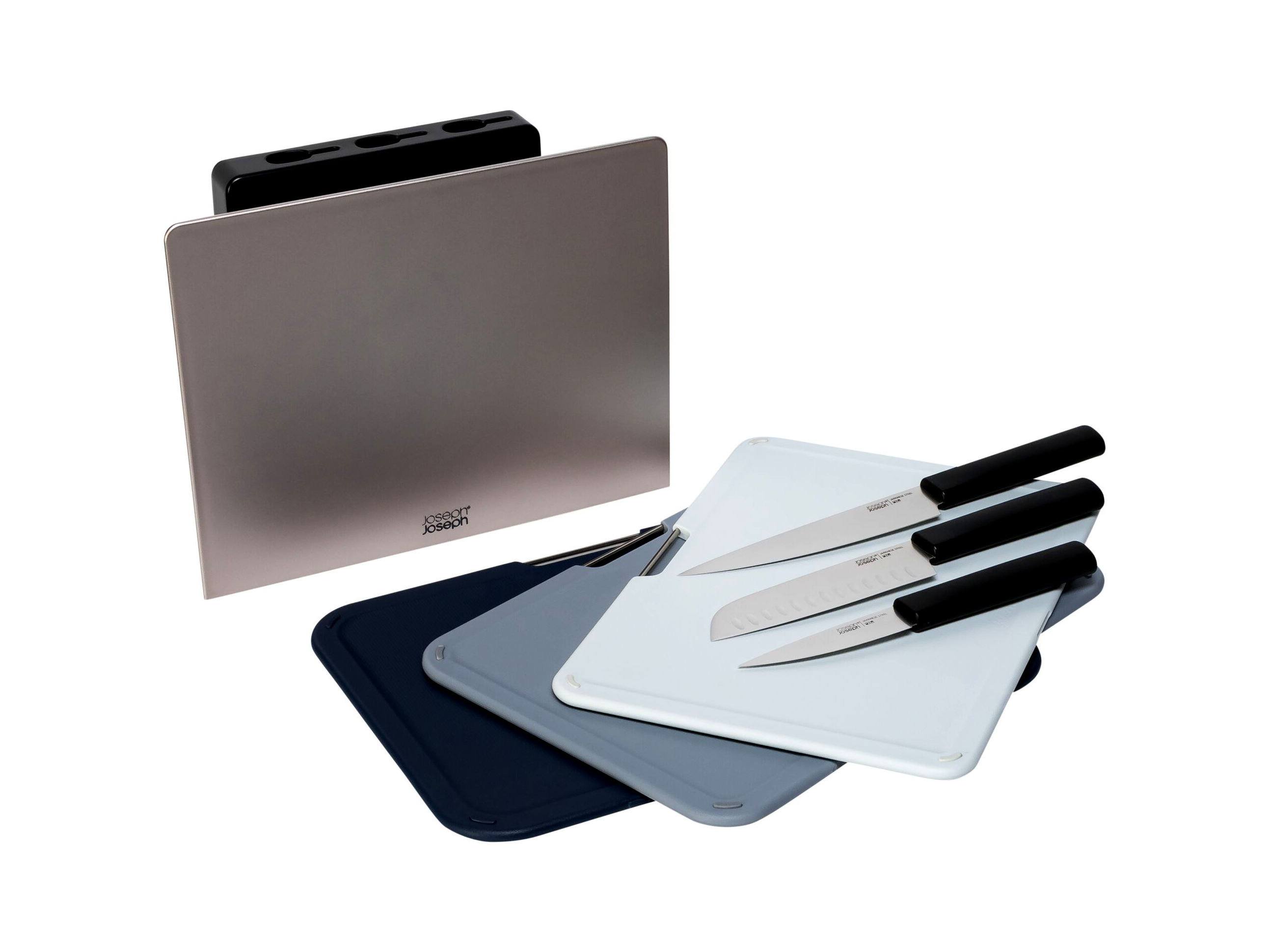 Ez a praktikus Joseph Joseph készlet mindent tartalmaz, amire a konyhában szükséged lehet! A három különböző méretű vágódeszka és a hozzá illő kések gondoskodnak a hatékony és biztonságos munkavégzésről. A készlet egy praktikus állványt is tartalmaz, így a deszkák és kések mindig rendezetten és kéznél lesznek.