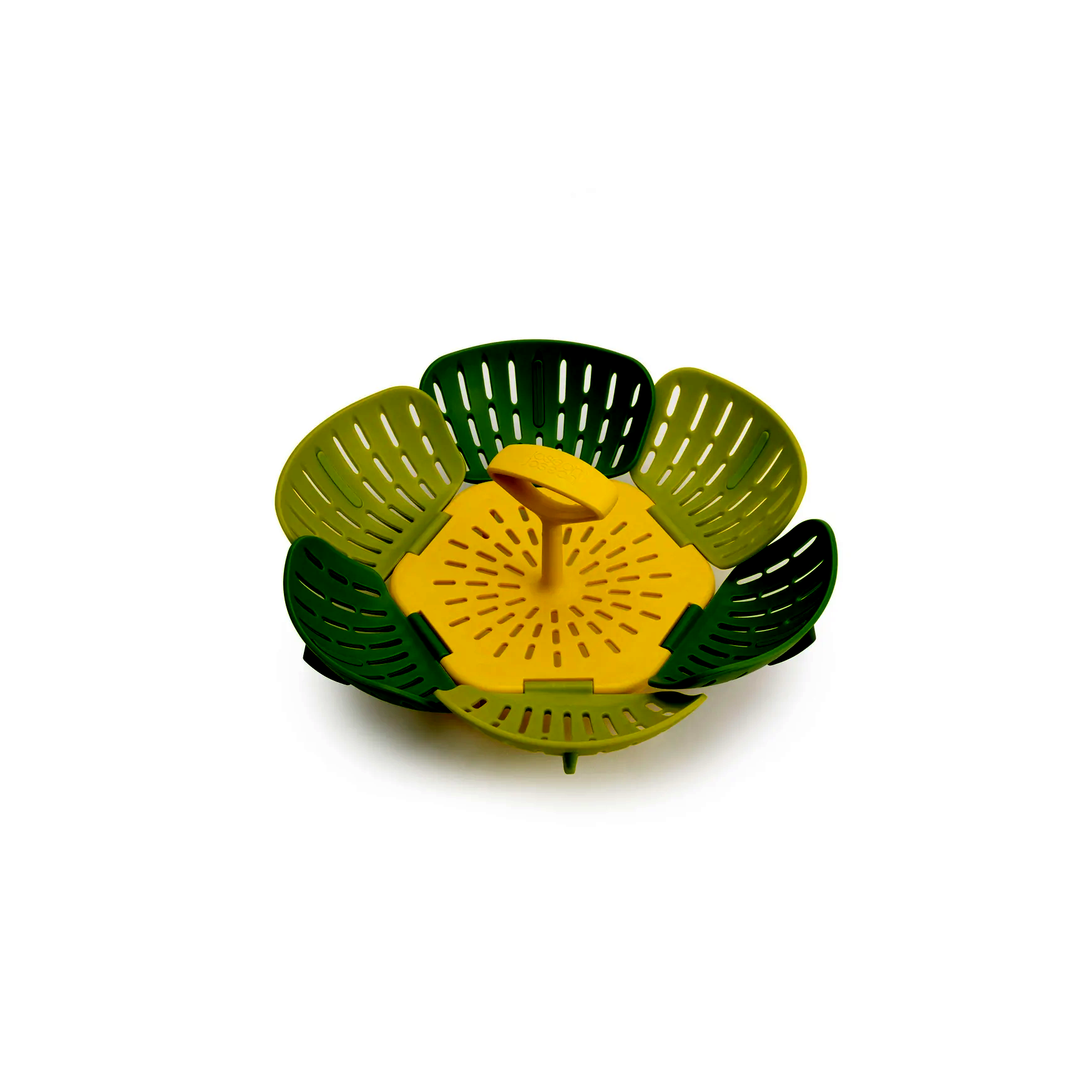 Önbeálló oldalaival, hőálló szilikon lábaival és szilikon oldalsó bordájával ez az összecsukható párolókosár tökéletes tapadásmentes és rozsdamentes acél edényekhez egyaránt.