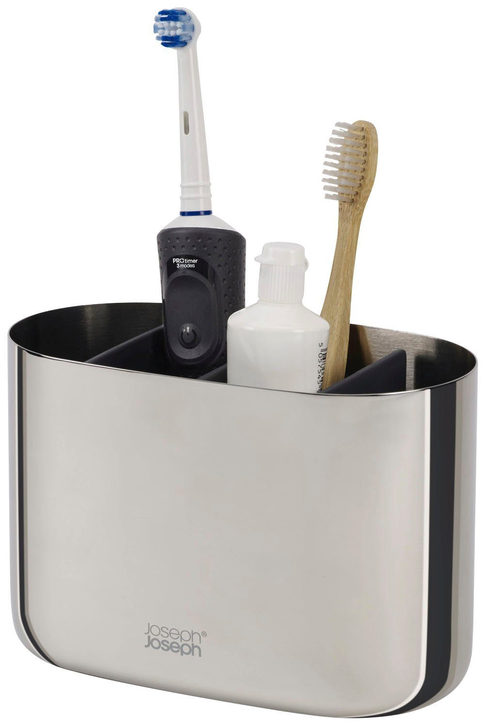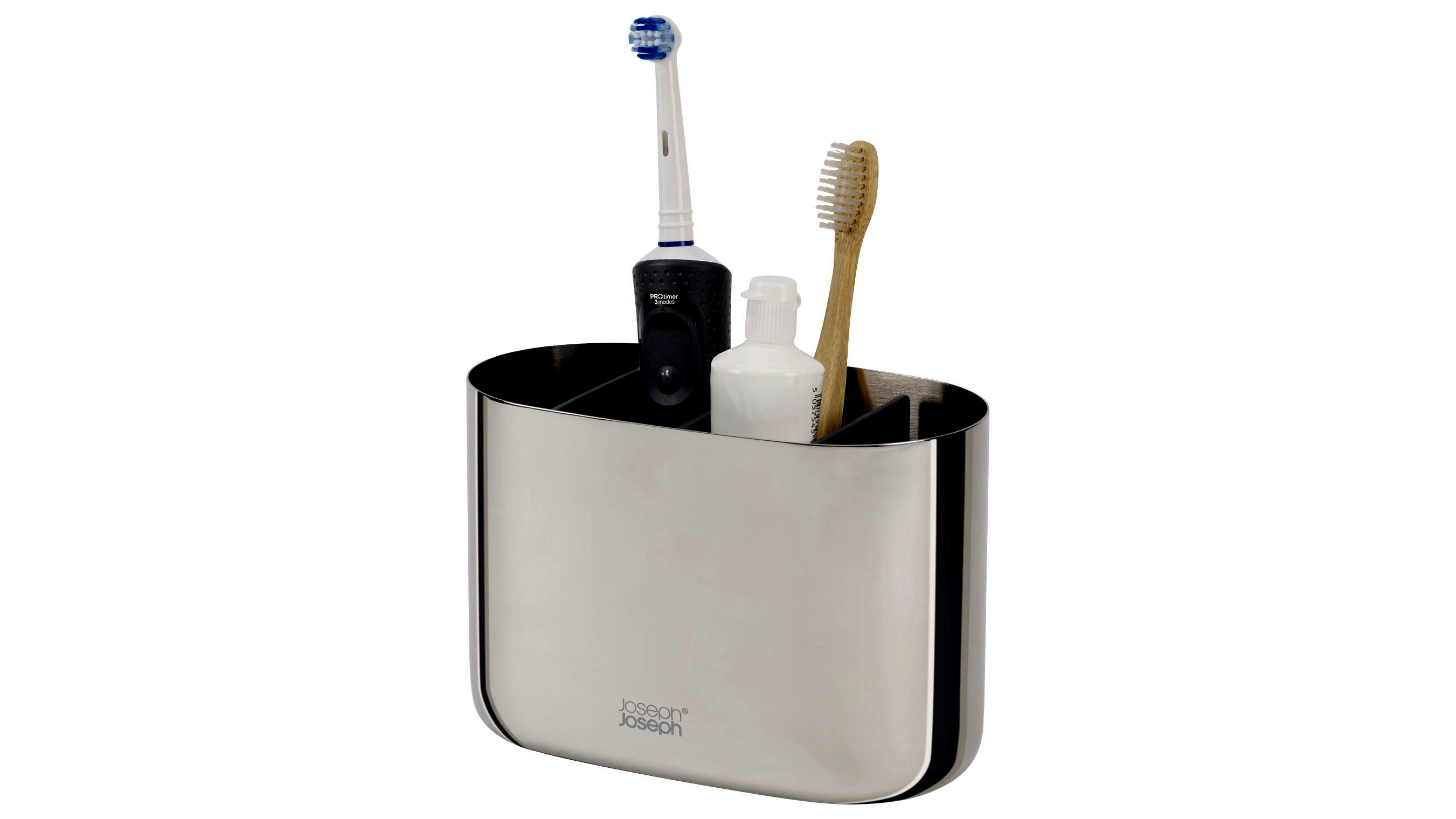 A Joseph Joseph EasyStore Luxe fogkefetartó elegáns polírozott rozsdamentes acél kivitelben készült. A tartó alkalmas elektromos fogkefékhez és fogkrém tubusokhoz, így minden szükséges eszközt egy helyen tarthat.