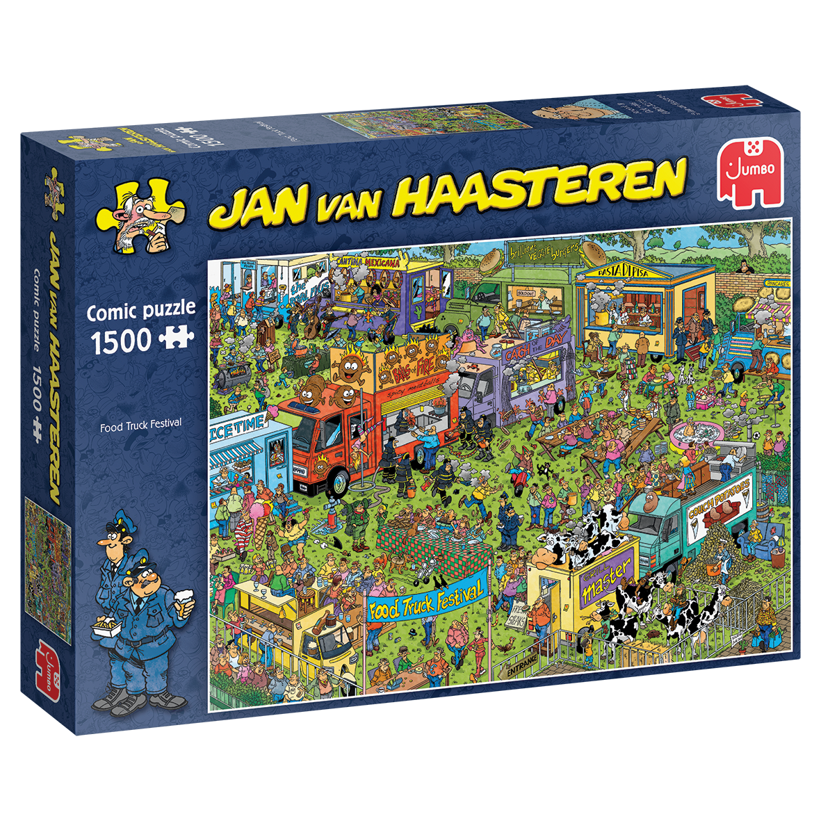 A Jan van Haasteren család jól érzi magát a food truck fesztiválon. A világ minden tájáról származó különleges ételek mellett nehéz megállni, még akkor is, ha jóllakottan is! Szerencsére a tűzoltók készen állnak a segítségre, ha a tűzgolyók egy kicsit túl tüzesek. A Jan van Haasteren puzzle sokkal több, mint egy egyszerű kirakós játék, ez egy kalandsorozat, amelyben ismerős karakterek játsszák a főszerepet egy véget nem érő, abszurd részletekkel teli dekorációban. Fedezd fel a Jan van Haasteren család őrült kalandjait! Büszkék vagyunk arra, hogy puzzleink újrahasznosított kartonból készülnek Európában. A karton puzzle-darabkákra való vágásához a legvékonyabb elérhető kést használjuk. A kirakó elkészültével a puzzle szinte varratmentes megjelenésű. Élvezze ezt a Jan van Haasteren puzzle-t!