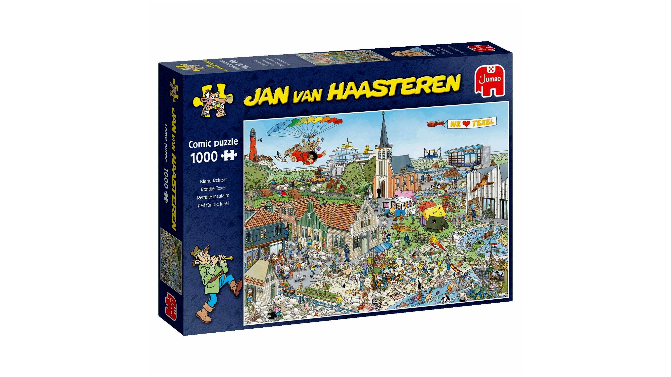 A Jumbo 1000 db-os puzzle - Jan Van Haasteren - Vakáció című képen a holland művész ábrázolásában vakációjukat töltő családokat láthatunk.