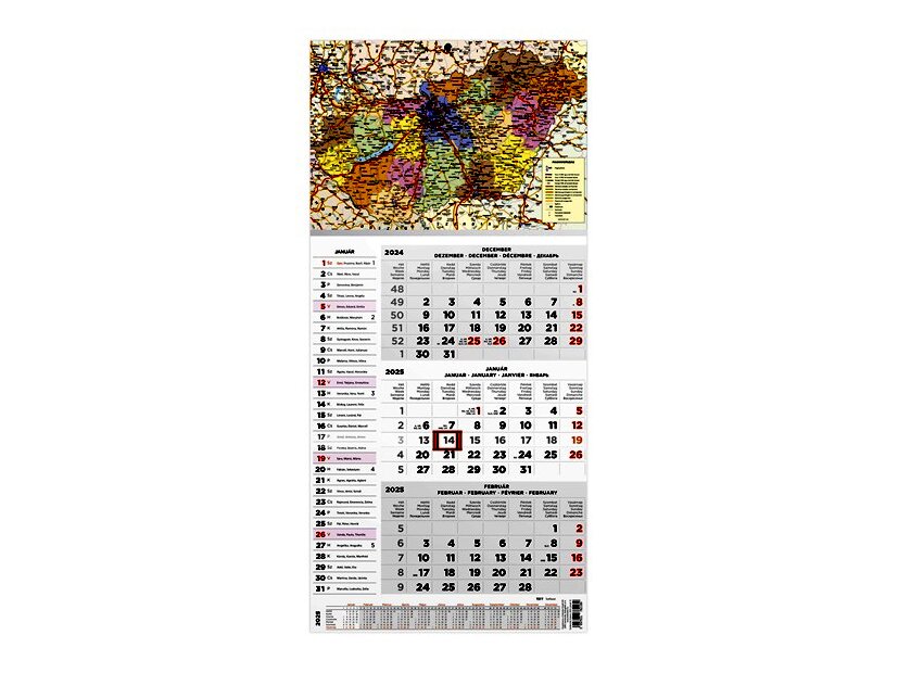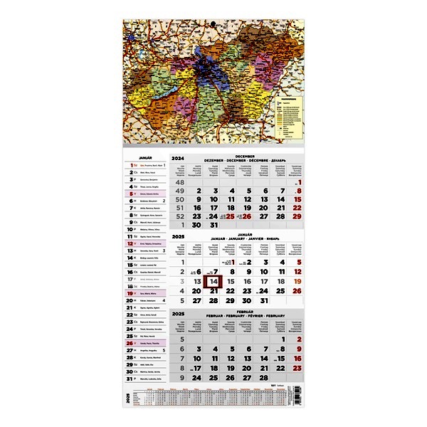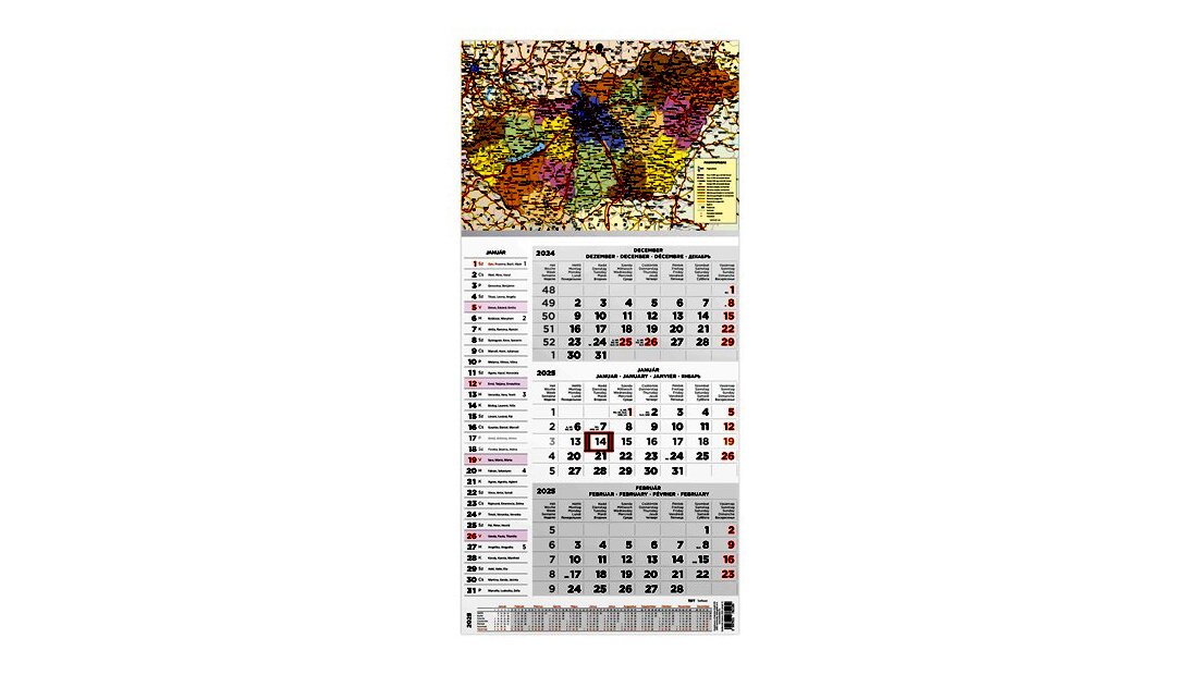 - Magyarország térképével kapható: A naptár fejrészén lévő részletes térkép megkönnyíti az útvonalak és helyszínek tervezését.