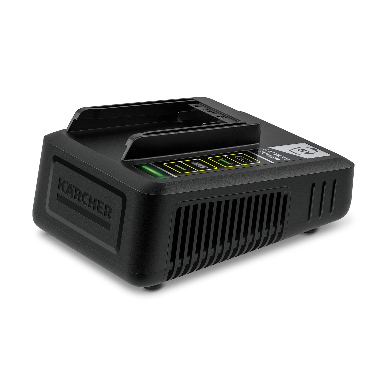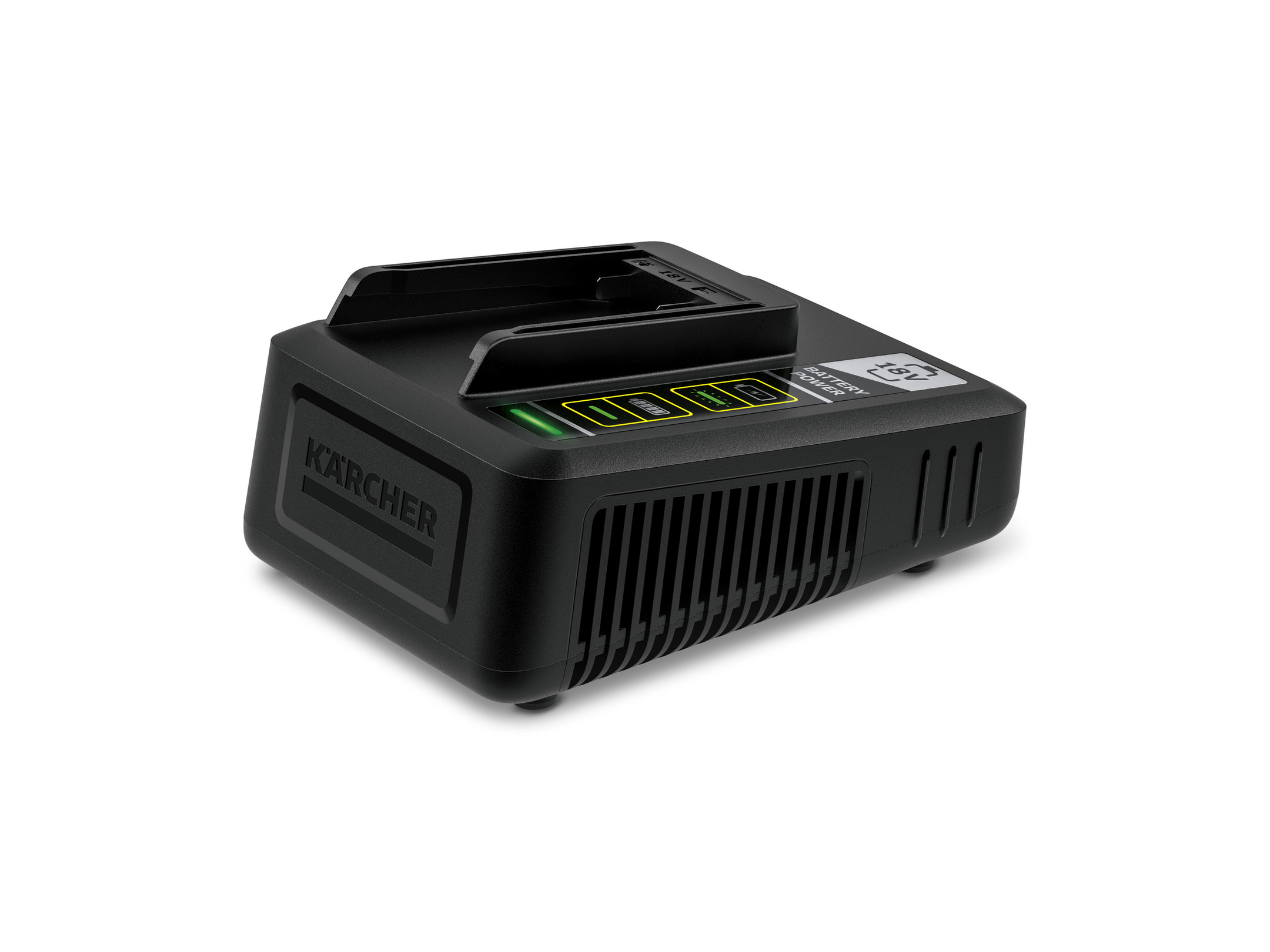 A gyorstöltő készülék a beépített fali tartónak köszönhetően egészen egyszerűen a falra rögzíthető. A gyorstöltő készülékkel a 18 V / 2,5-s Ah Kärcher Battery Power pótakkumulátor mindössze 44 perc alatt 80%-osra tölthető. Minden Kärcher 18 V-os Battery Power akkumulátor-platformú 18 V-os Battery Power pótakkumulátor töltésére alkalmas.