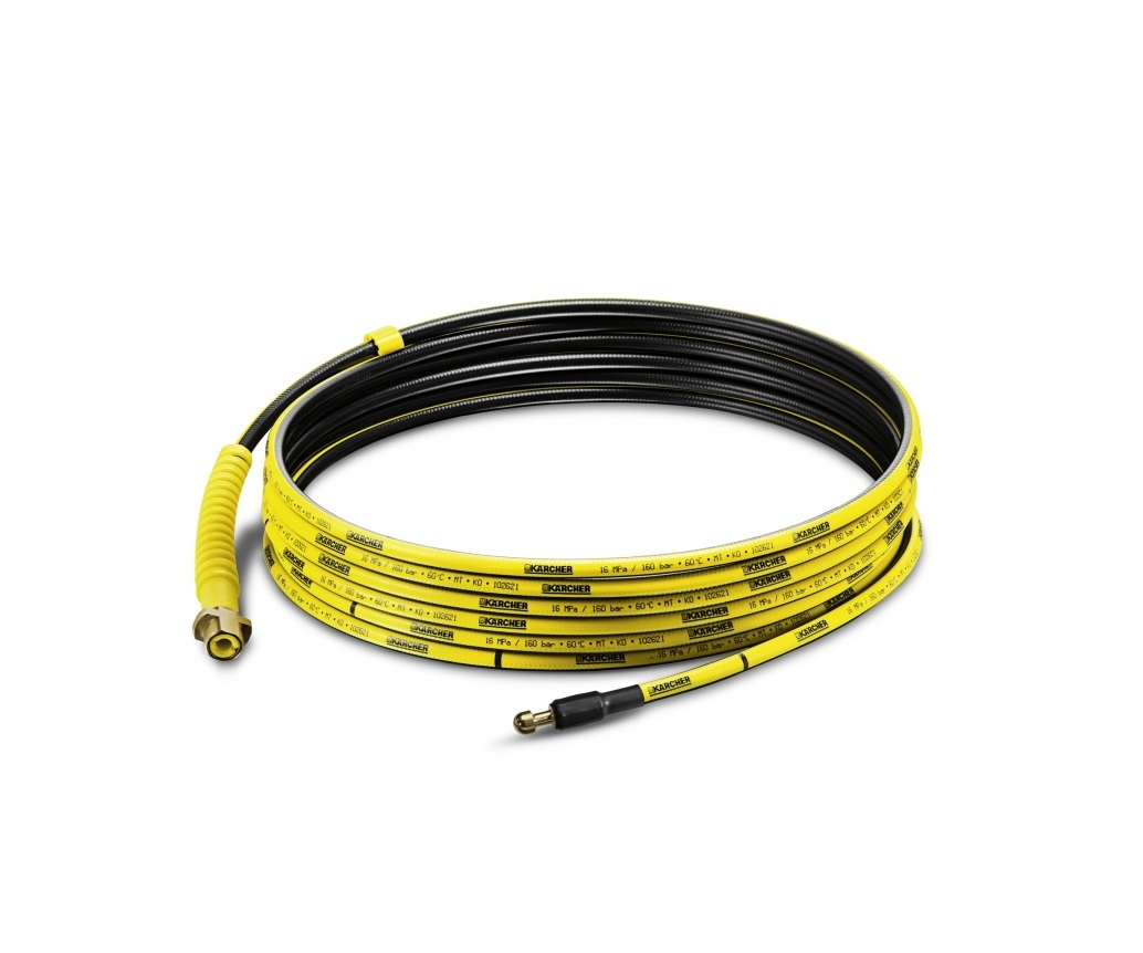 Csőtisztító-készlet csövek, lefolyók, kifolyók és toalettek tisztításához és dugulások eltávolításához. Négy hátrafelé irányított magasnyomású sugár áttolja a tömlőt a csövön és feloldja a dugulást. Folyamatos jelölés és jelölőgyűrű mutatja az előrehaladást a csőben. A rugalmas 7,5 m minőségi tömlő textilfonattal van megerősítve és rendkívül rövid sárgaréz fúvókával rendelkezik a csőben való optimális mozgáshoz. Emellett a cső megtörés elleni védelemmel és sárgaréz csatlakozóval is felvan szerelve a hosszú élettartamért. Alkalmas házban való használatra és kültérben minden K2-K7 közötti kategóriájú, továbbá a G4.10 és a G7.10 Kärcher háztartási magasnyomású mosóval.