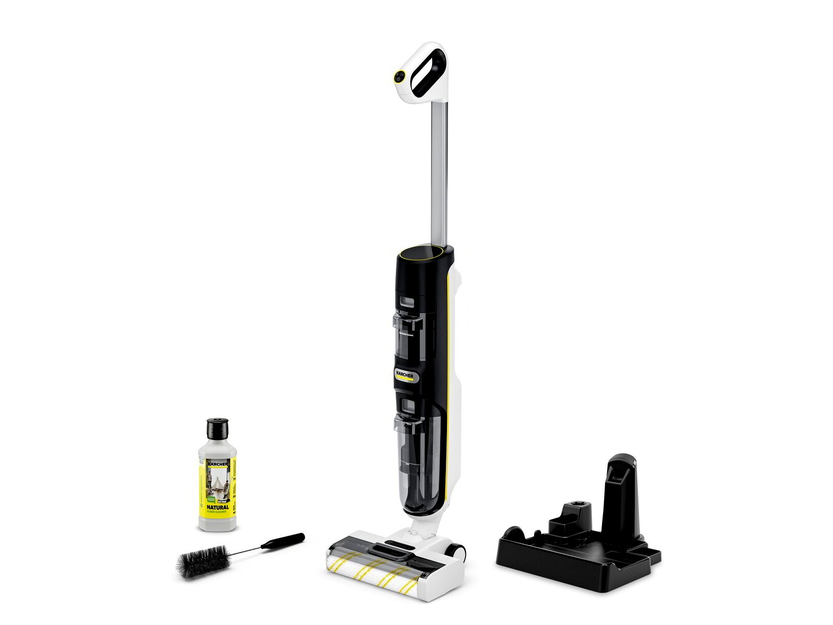 A praktikus parkoló- és tisztítóállomás lehetővé teszi, hogy a készülék saját magát tisztítsa. A hengerek forgás közben friss vízzel átmosódnak, így a szennyeződés a szennyezettvíz-tartályba kerül, nem pedig vissza a padlóra. Ez higiénikusabb működést és kevesebb karbantartást jelent a felhasználó számára.