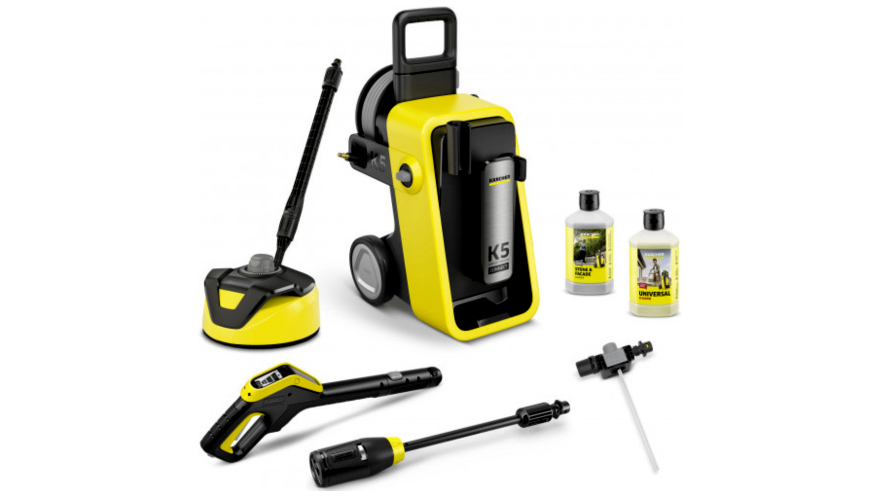 • T 5 felülettisztító: nagy felületek (teraszkövek, járdalapok, térkő, garázsbejáró) fröccsenésmentes, egyenletes tisztításához – jelentősen gyorsabb, mint a szabad sugárral végzett mosás.