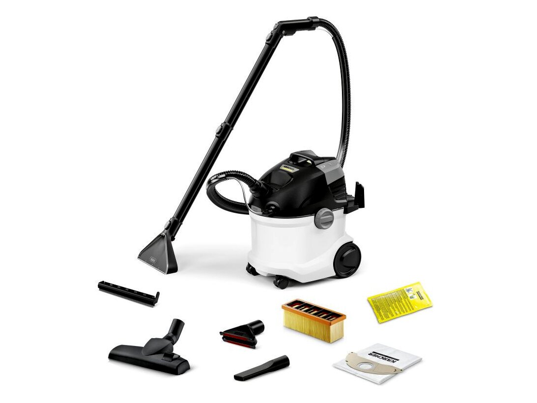 A Kärcher SE 5 EU kárpit- és szőnyegtisztító ergonomikus kialakításával és multifunkcionalitásával vonzó választás minden háztartás számára. Ez a készülék ideális higiénikus tisztításra számos textilfelületen, például szőnyegek, kárpitozott bútorok, szőnyeggel borított lépcsők, matracok, falikárpitok és autóülések esetén.