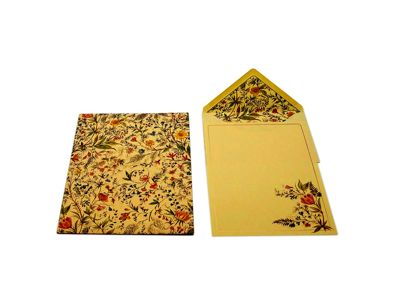 - Papír típusa: Krémszínű papír, tavaszi virágmintával