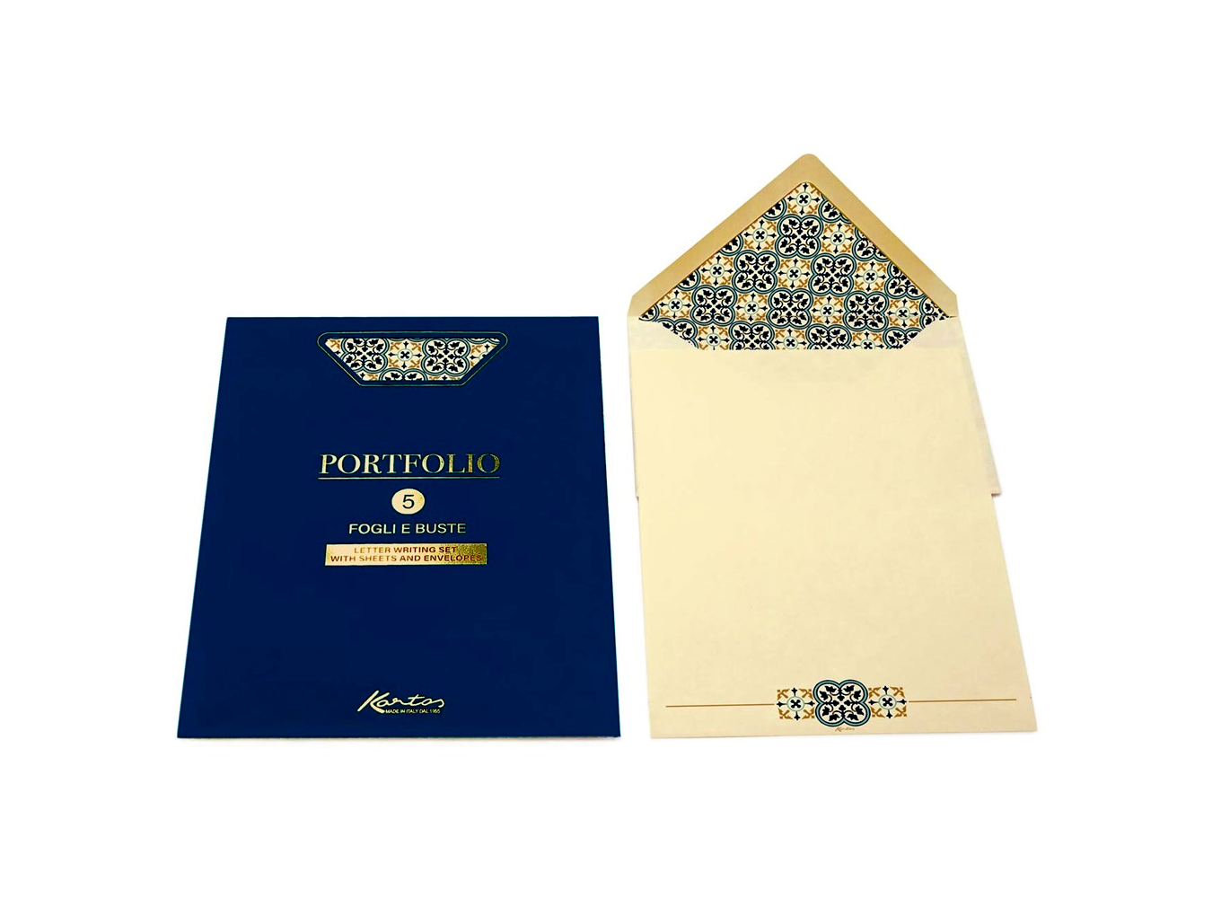 A Kartos Quadrilobo levélpapír szett valódi műalkotás, melyben a krémszínű lapok és a gyönyörű borítékok élettel telkítik meg az írás örömét. A kék geometrikus mintás borítékok borostyánlevéllel és aranyporral díszítettek, amelyek eleganciát és egyediséget kölcsönöznek minden levélnek.
