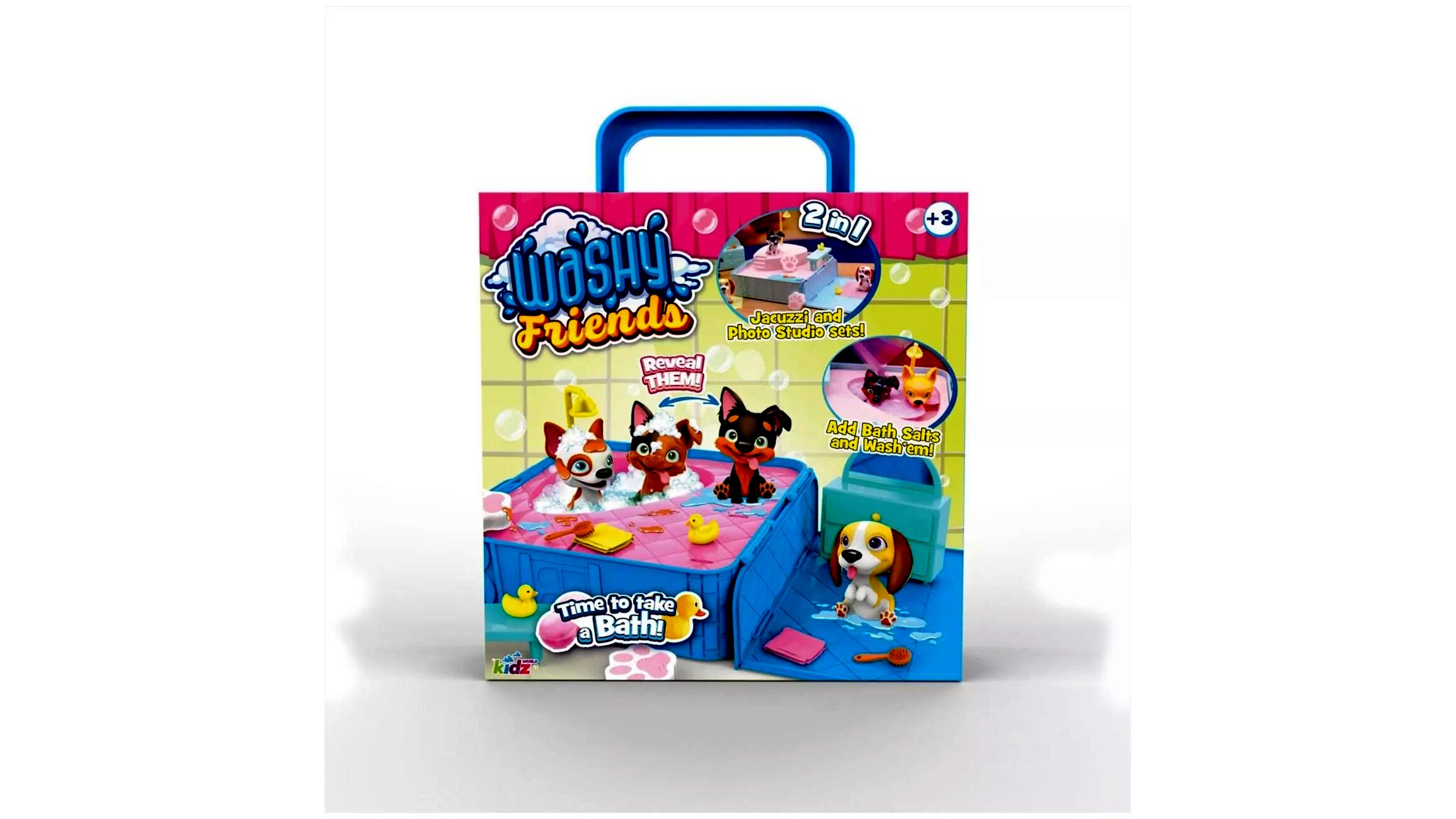 A Washy Friends kutyusok imádnak játszani - akár sáros időben is, ezért "sáros" bundával érkeznek meg a kis gazdikhoz. Így aztán elsőként a gyerekeknek meg kell fürdetniük a kiskedvencüket. És most jön a varázslat! Csak a fürdetés után derül ki, milyen színű a bundája a kutyusnak! Kész szerencse, hogy a szettben található egy jacuzzi is, amiben a kutyák fejedelmi ellátásban részesülhetnek.