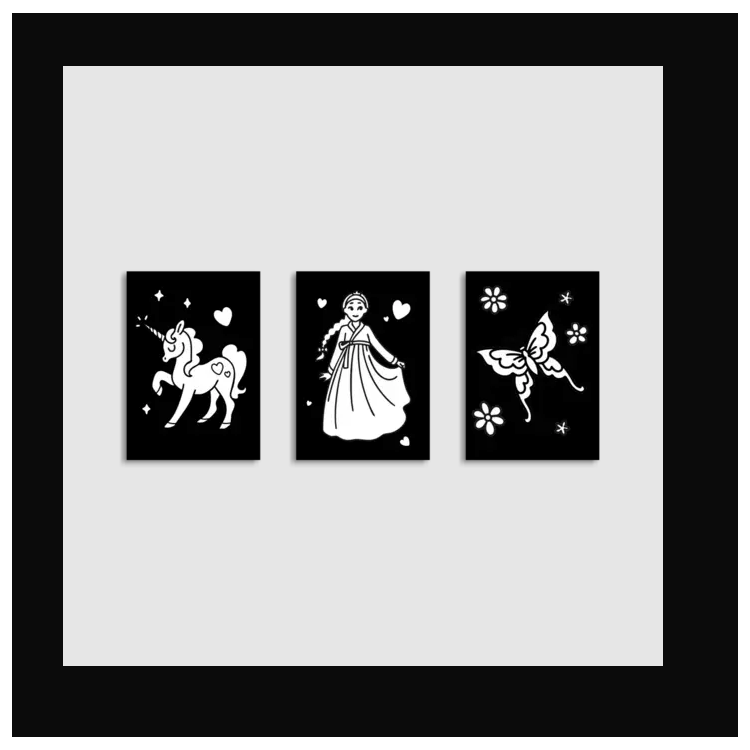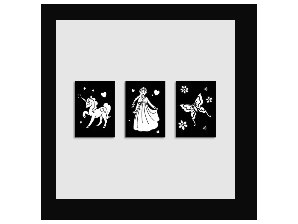 A készlet 3 különböző, előre perforált táblát tartalmaz tündérmese témában. A rózsaszín neon vezeték világításra kelti a motívumokat, így a kész alkotások nappal dekoratív képek, sötétben pedig hangulatos, világító díszek.