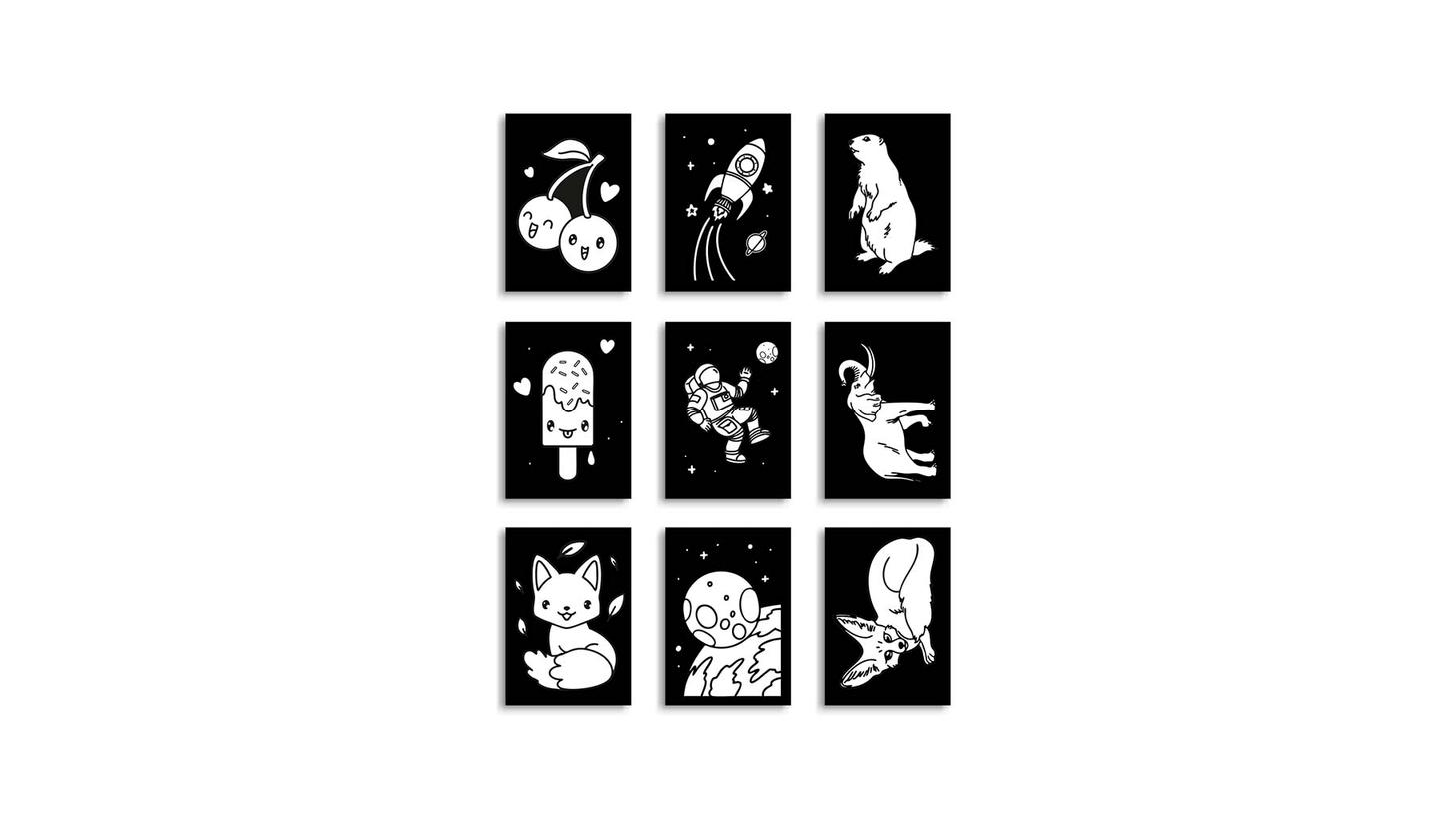 • 9 db egyedi illusztráció (állatok, dinoszauruszok, űr témák)