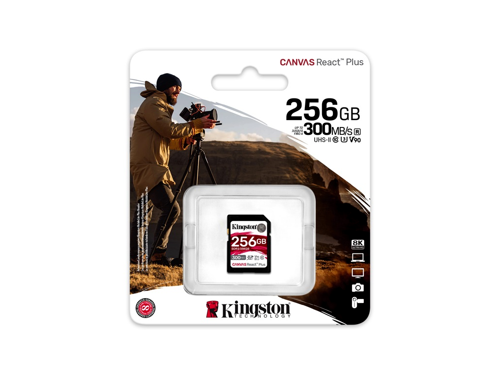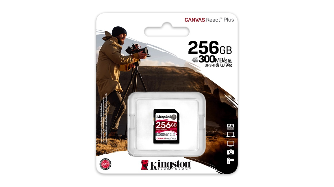 A Kingston Canvas React Plus SD-kártyája nagy teljesítményű sebességet biztosít, amelyet úgy terveztek, hogy az ipari szabványnak megfelelő professzionális kamerákkal működjön együtt a 4K/8K videókat és nagy felbontású fényképeket készítő kreatívok számára.