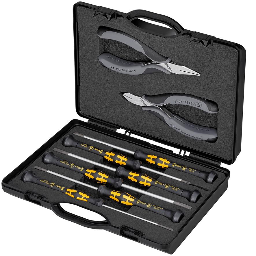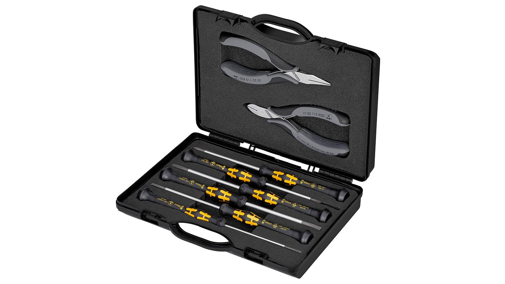 Ez az elektronikai javító készlet a Knipex-től minden olyan szerszámot tartalmaz, amelyre szükséged lehet az elektrosztatikus biztonságra érzékeny munkakörnyezetben.