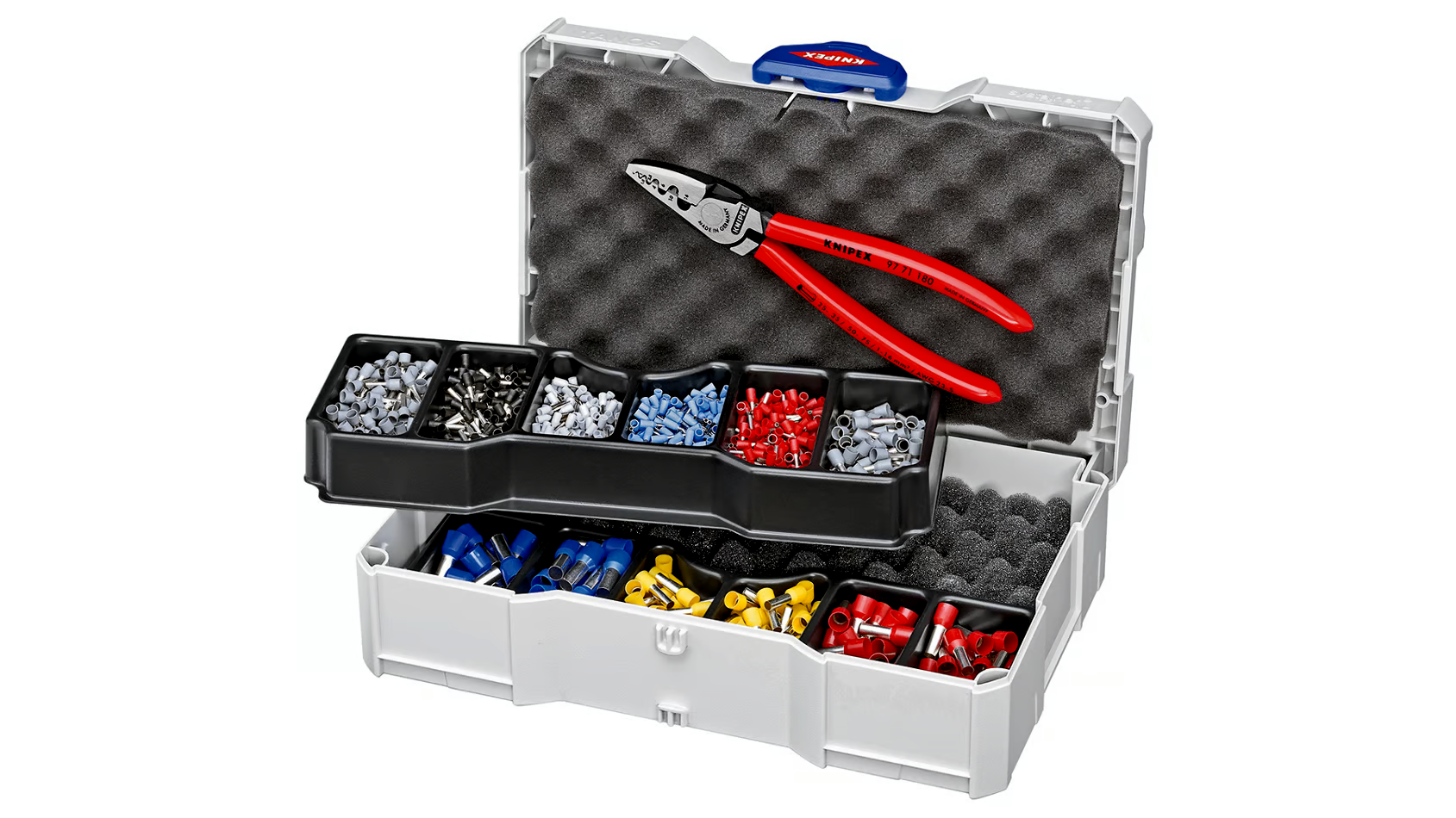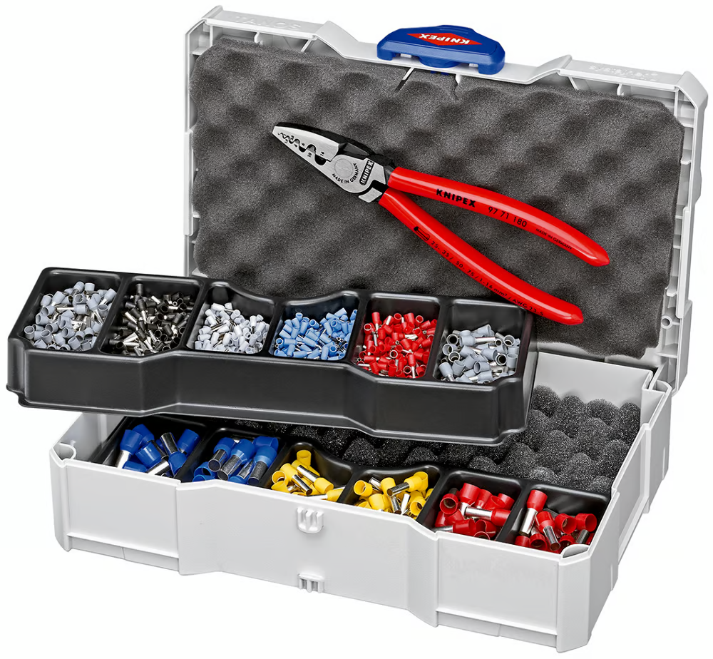 A készlet egy praktikus TANOS MINI-systainer® műanyag dobozban kapható, amely biztosítja a tartós és biztonságos tárolást. A készlet két darab egymásra rakható műanyag betétet tartalmaz, amelyek 6-6 mélyedéssel rendelkeznek a csatlakozók számára. Az érvéghüvely választék magában foglalja a műanyaggallér nélküli és műanyaggallérral ellátott érvéghüvelyeket is. A készletben található még egy precíziós érvéghüvelyfogó is, a 97 71 180-as modell.