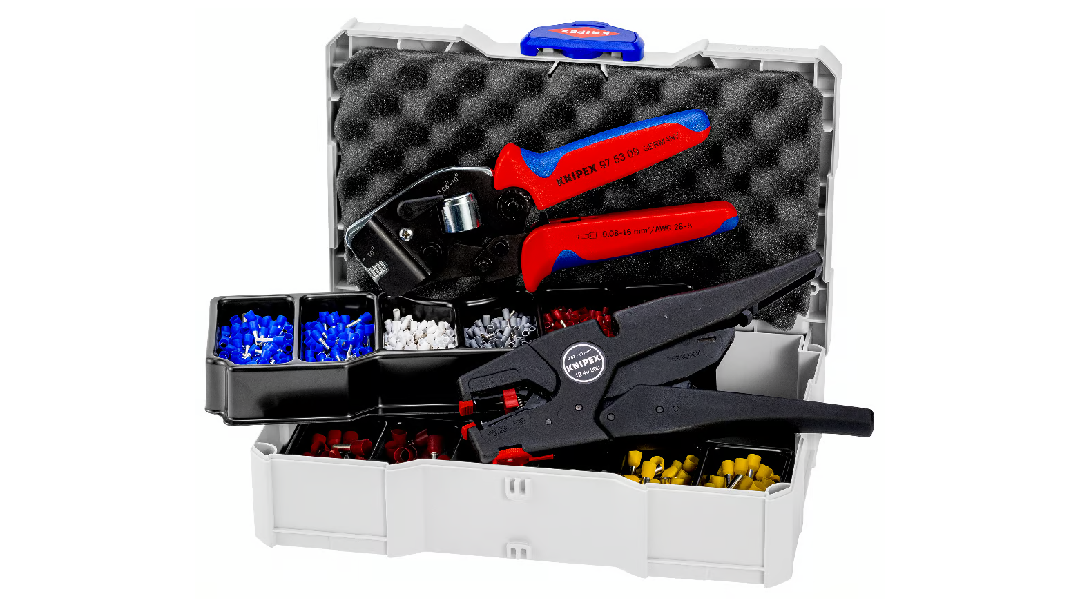 - Professzionális szerszámok: A készlet tartalmaz egy krimpelő fogót (97 53 09) aderendhüvelyekhez és egy önbeálló szigetelőcsupaszítót (12 40 200).