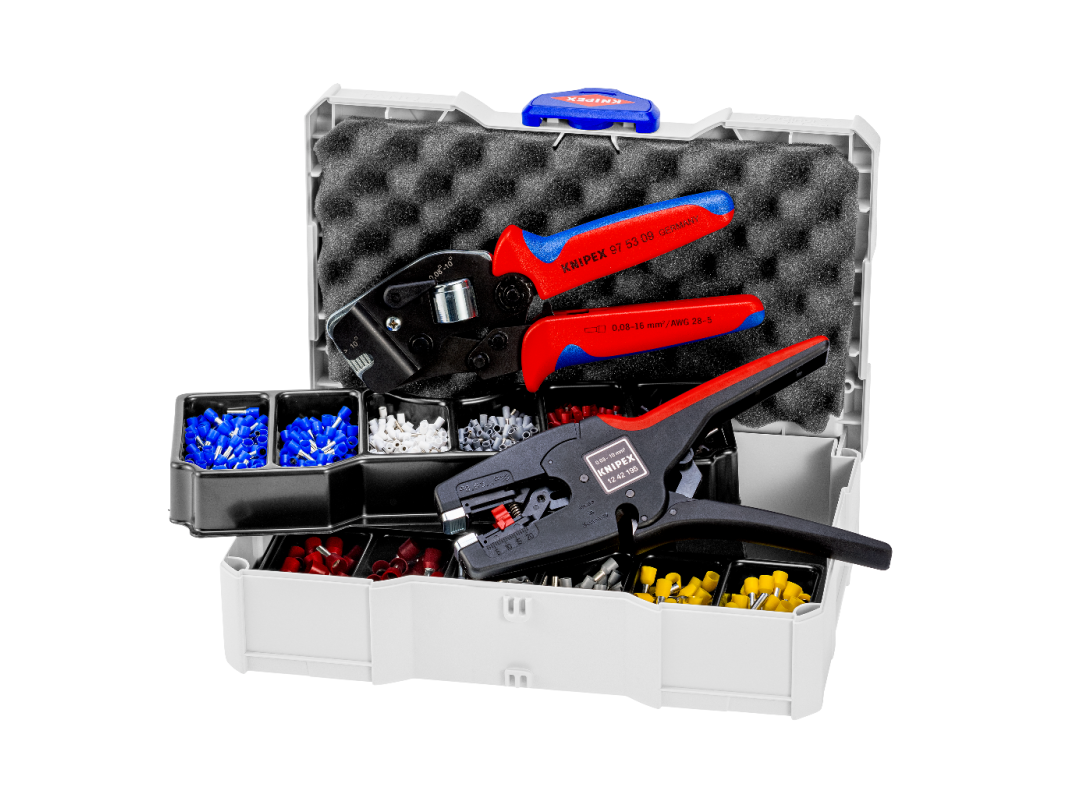 A Knipex 97 90 17 Krimpelő Készlet kiváló választás mindazoknak, akiknek napi rendszerességgel kell kábelezési feladatokat végezniük. A készlet tartalmaz 97 53 09 krimpelő fogót, amely tökéletesen illeszkedik a vezetékhüvelyekhez, valamint egy 12 42 195 önbeállító csupaszító fogót, amely precíz és gyors csupaszítást tesz lehetővé.