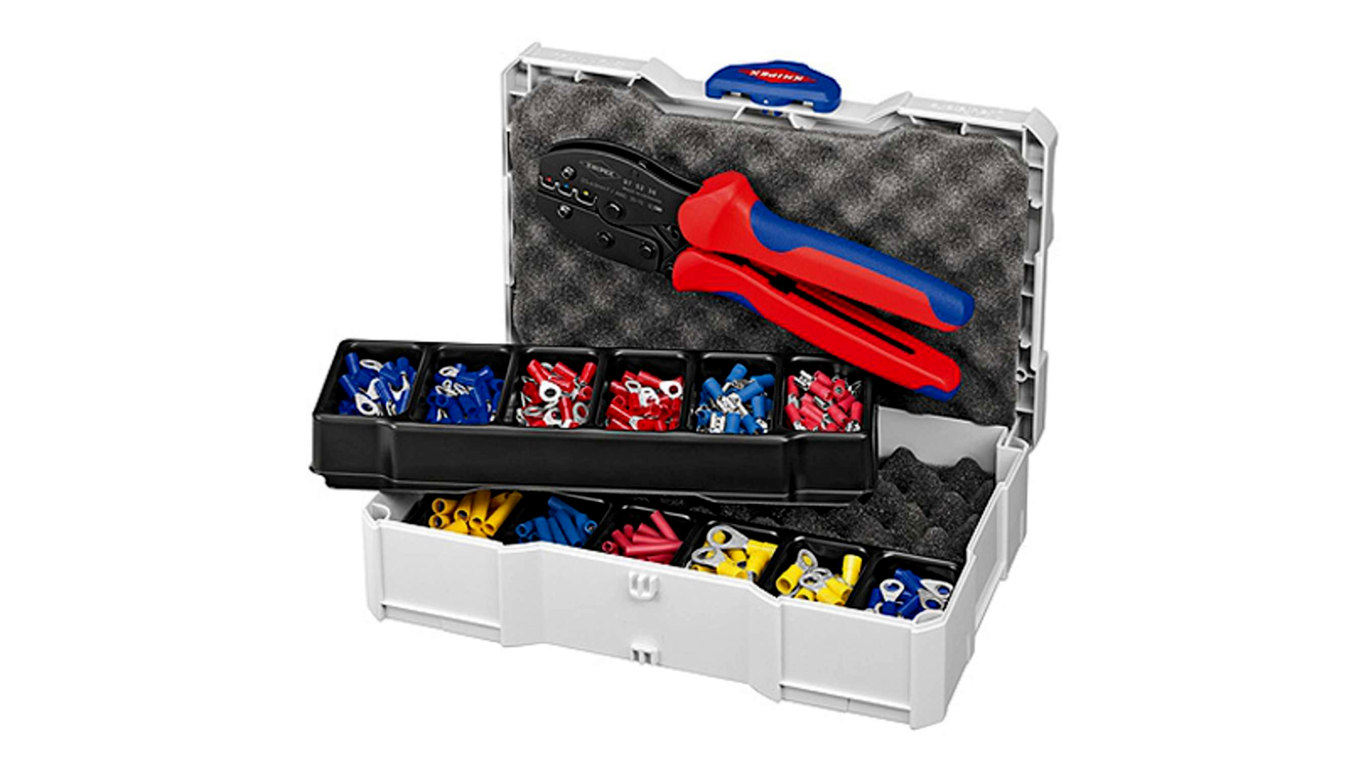 - PreciForce® krimpelő fogó: Tartalmazza a Knipex 97 52 36 PreciForce® krimpelő fogót, amely kiválóan alkalmas szigetelt kábelsaruk és összekötők precíz krimpelésére.