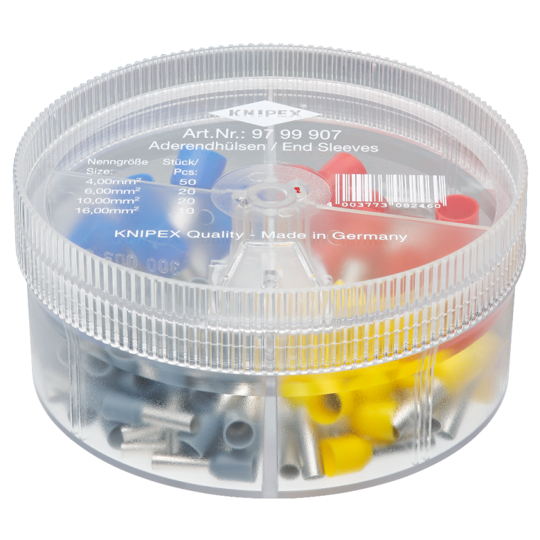 - Érvéghüvely mennyiségek: 50 darab 4 mm², 20 darab 6 mm², 20 darab 8 mm², 10 darab 16 mm²