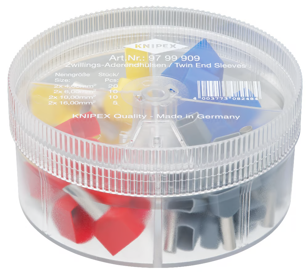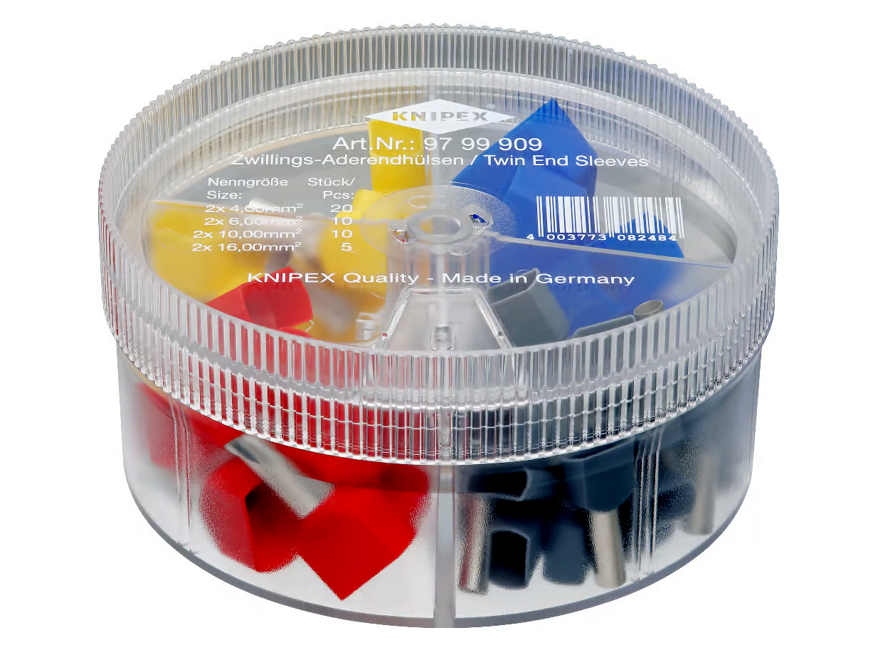 A Knipex 97 99 909 rendeződoboz nélkülözhetetlen kiegészítő minden olyan munkaterületen, ahol gyakoriak a kábelvégek érvéghüvelyezése. A szóródoboz benne lévő különféle méretű és színkódolt hüvelyek ideális megoldást biztosítanak a kábelek szakszerű és biztonságos kezeléséhez és rögzítéséhez.