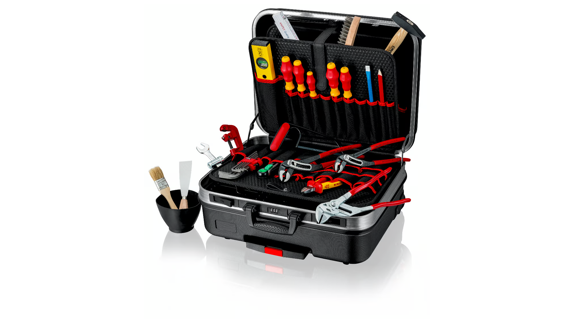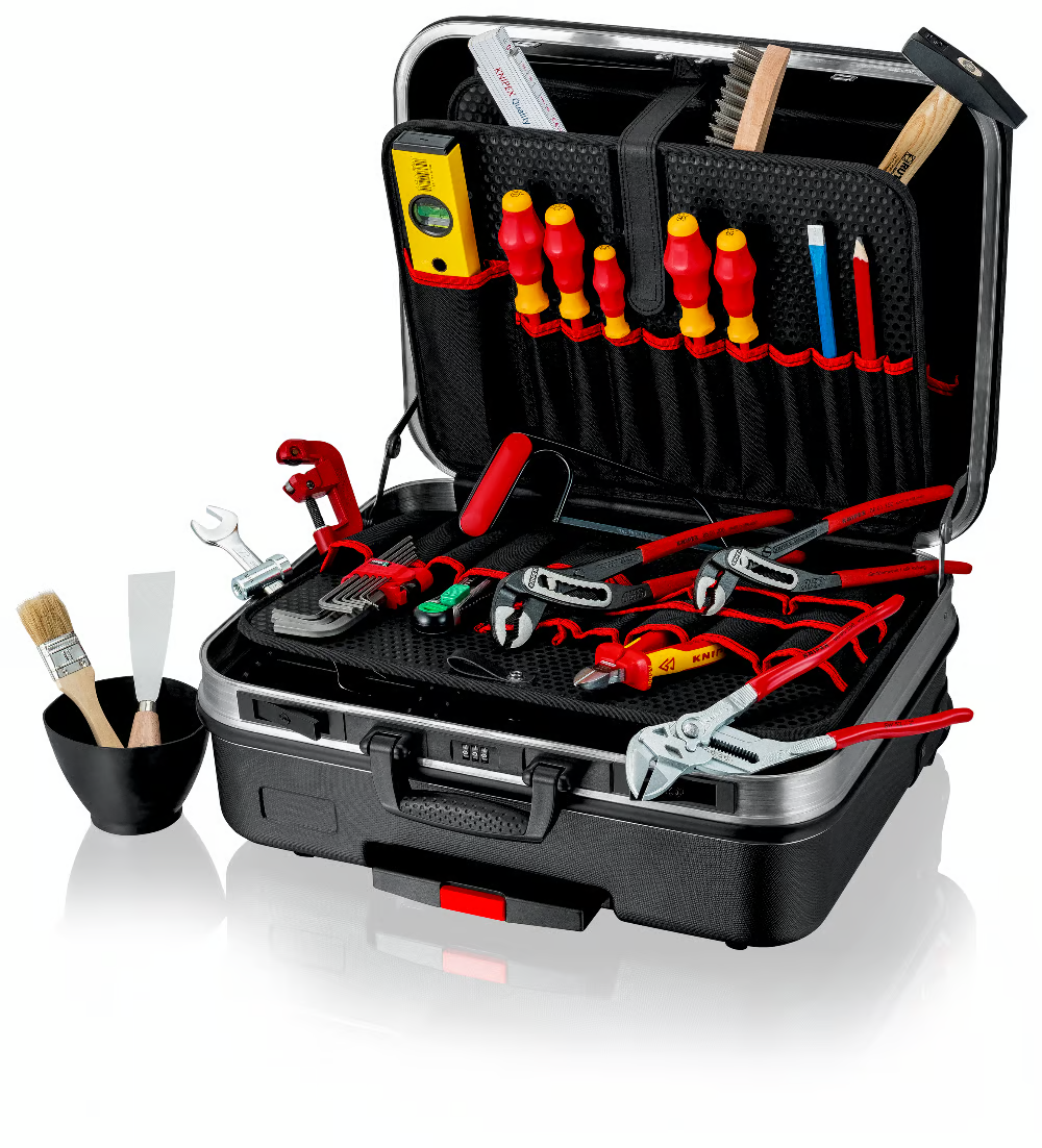 A KNIPEX BIG Basic Move Sanitr szerszámkészlet minden szakember számára ideális választás, aki megbízható és strapabíró szerszámokat keres. Ez a 31 darabos készlet egy strapabíró ABS anyagból készült bőröndöt tartalmaz, amely trolley-funkcióval és körbefutó alumínium kerettel rendelkezik. A bőrönd oldalain található rugalmas pántok és kis zsebek számos tárolási lehetőséget kínálnak a szerszámok számára.