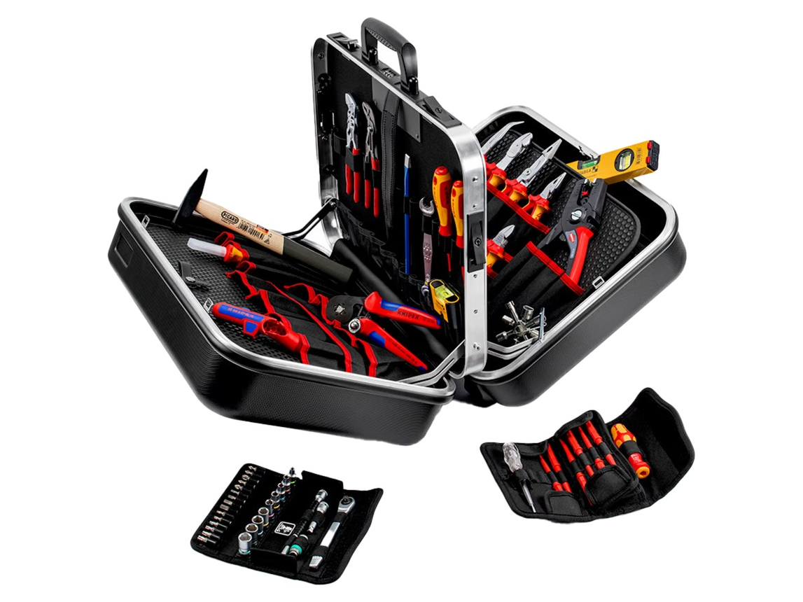 A KNIPEX BIG Twin Move Elektro szerszámkoffer összesen 63 márkás szerszámot tartalmaz, köztük 14 KNIPEX szerszámot, amelyek egy része megfelel a VDE szabványoknak (DIN EN 60900). A szett tartalmaz: