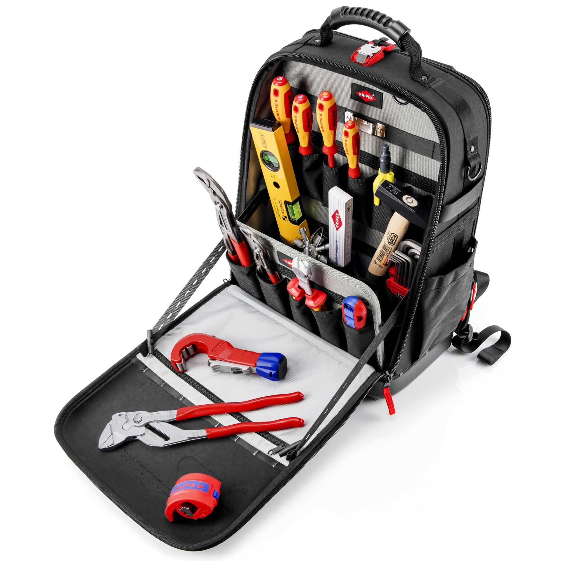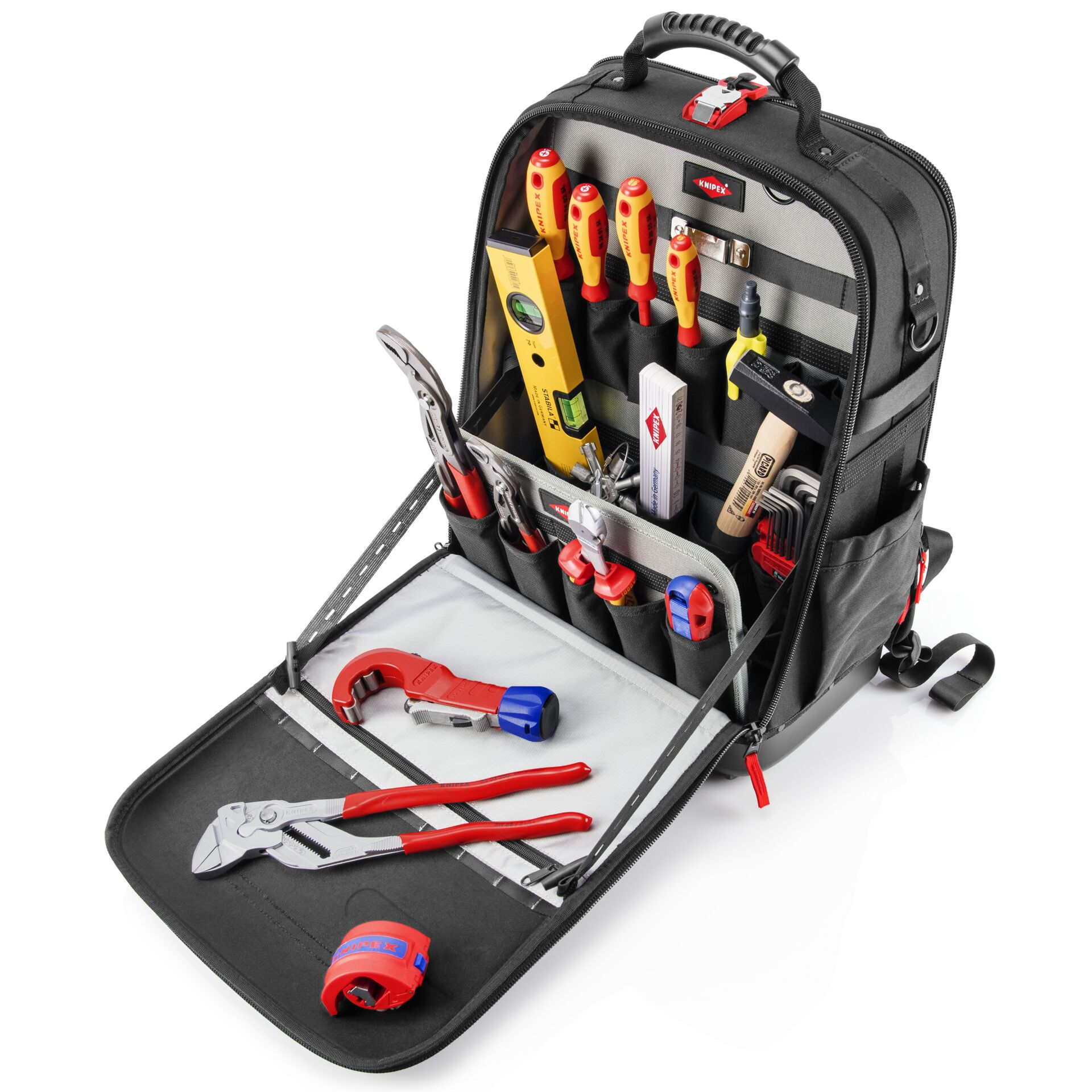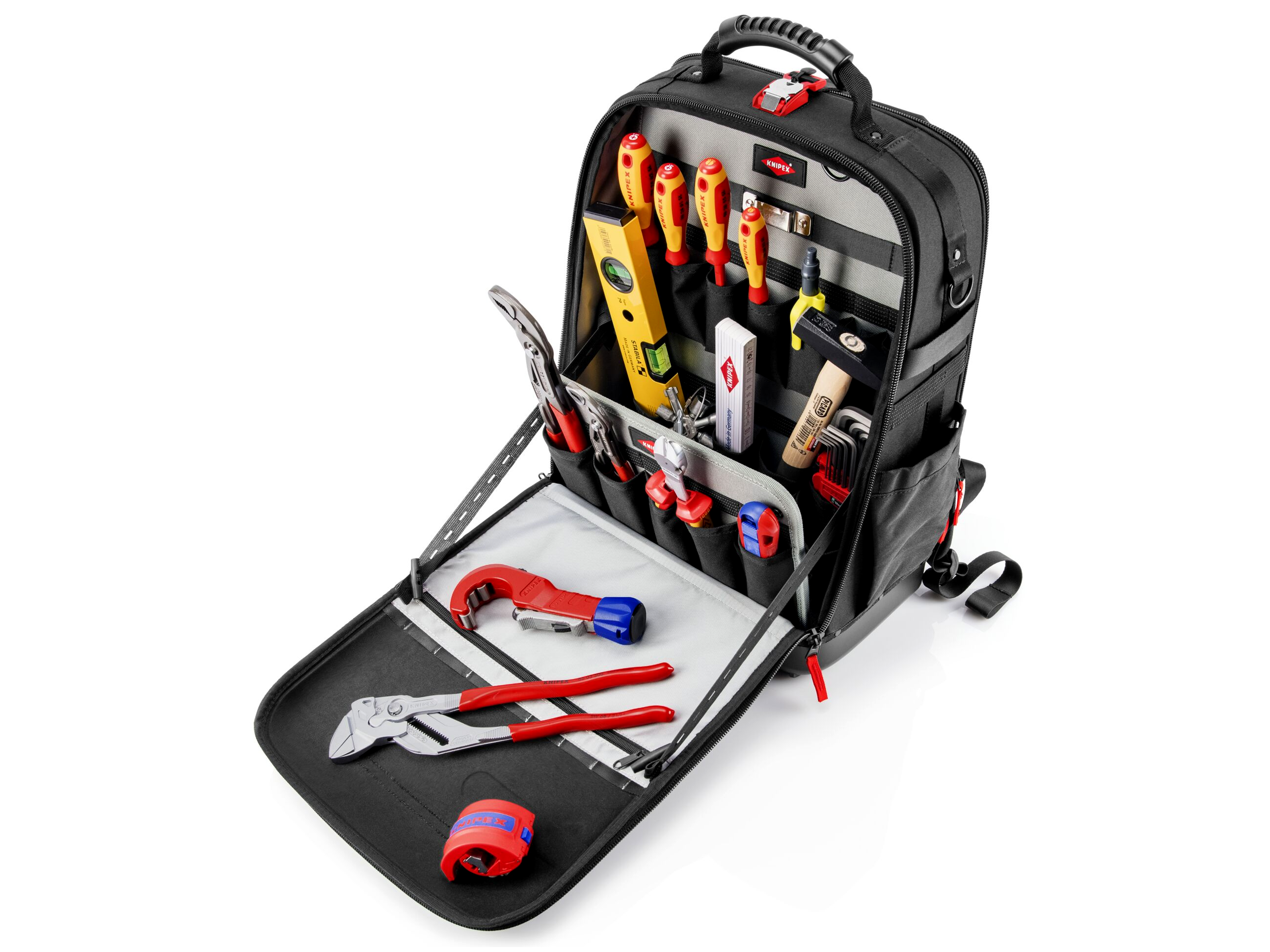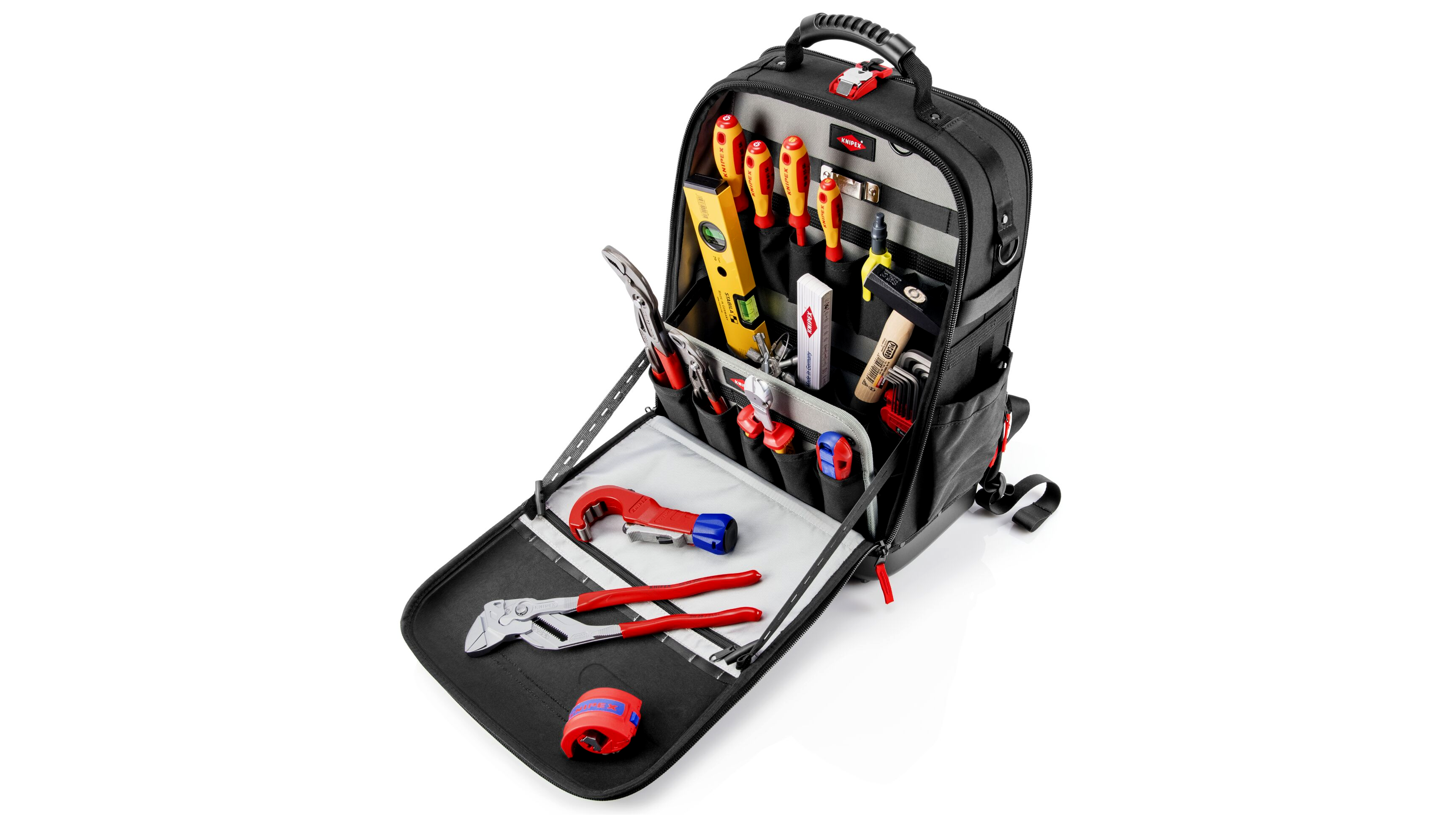 - Sokoldalú tárolóhelyek: Két különálló belső rekesz áll rendelkezésre szerszámok, mérőműszerek, notebook vagy tablet számára, valamint 21 rögzítőhurok és 37 zseb, amelyekből több cipzáras.