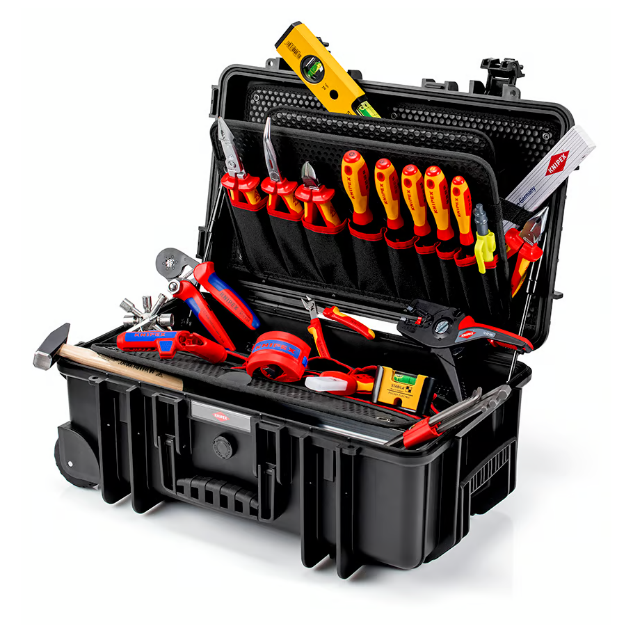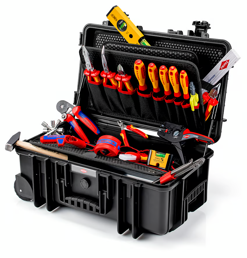 A koffer 16 KNIPEX és 22 márkás szerszámot tartalmaz, köztük VDE-tanúsítványúakat is: Zangák, oldalcsípők, szigetelő szerszámok, csavarhúzók, kábelkés, kalapács, colstok, vízmérték.