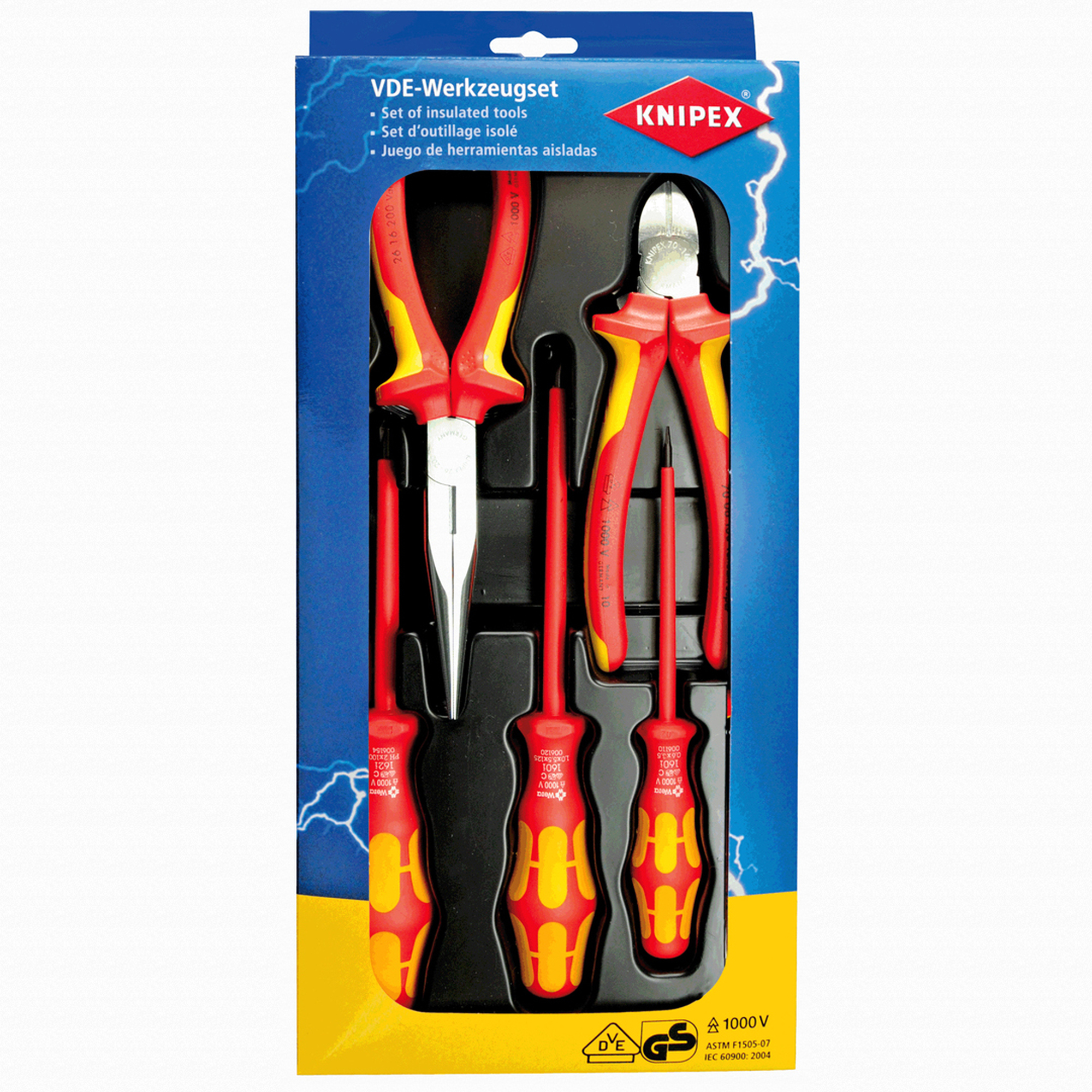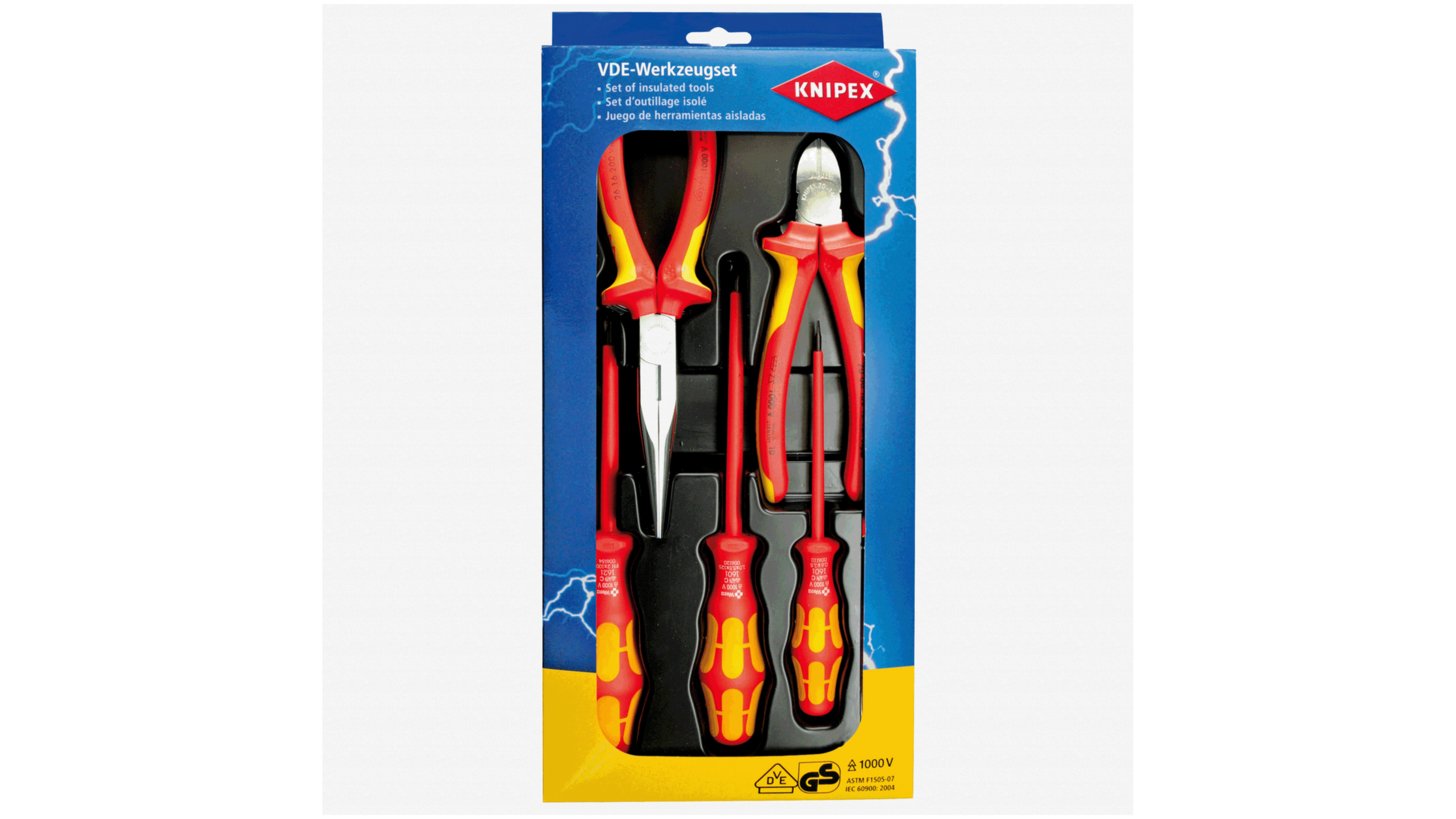 - VDE-engedéllyel rendelkező szerszámok a DIN EN/IEC 60900 1000V szerint, krómozott fogók; markolatok többkomponensű burkolattal