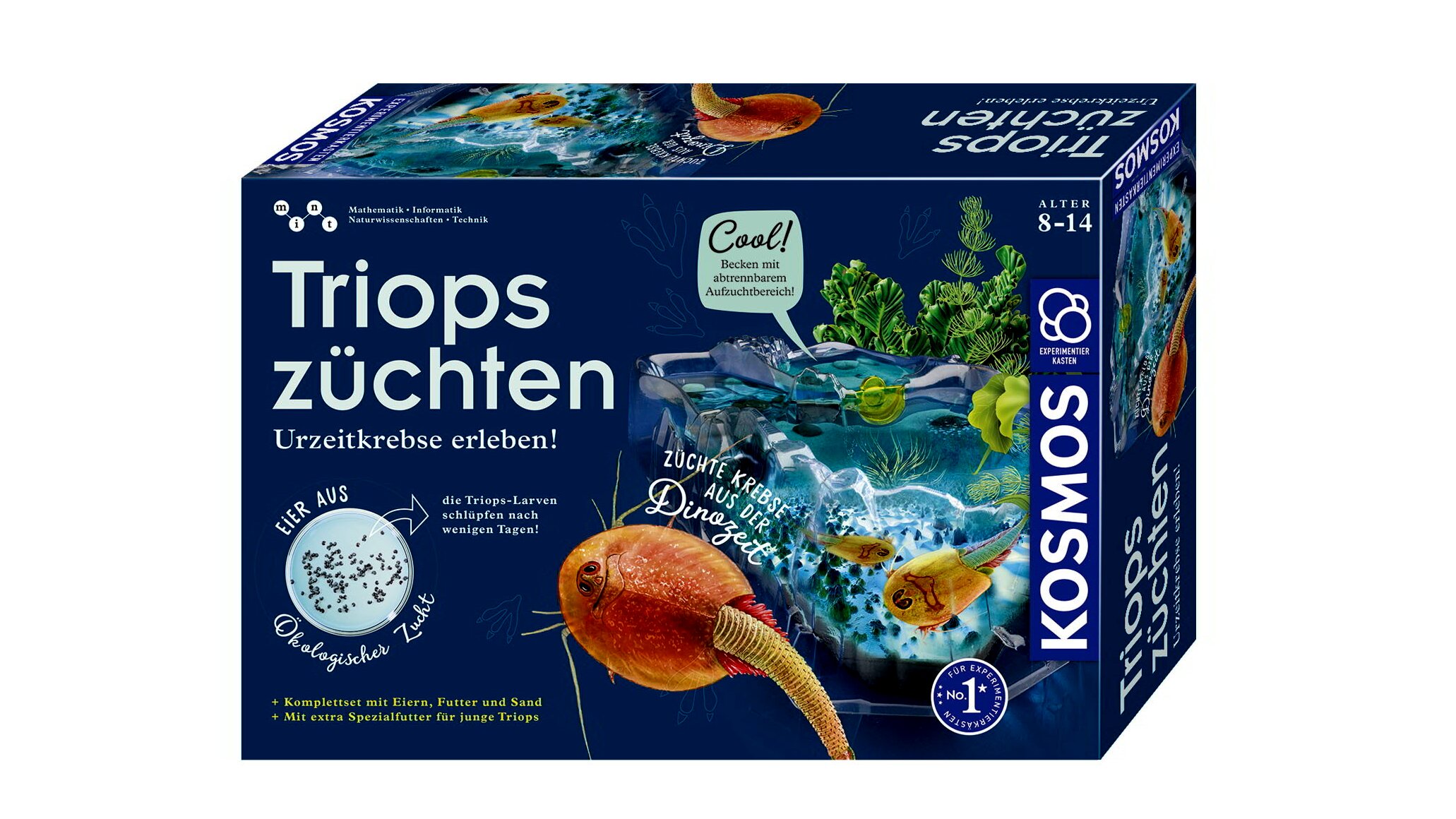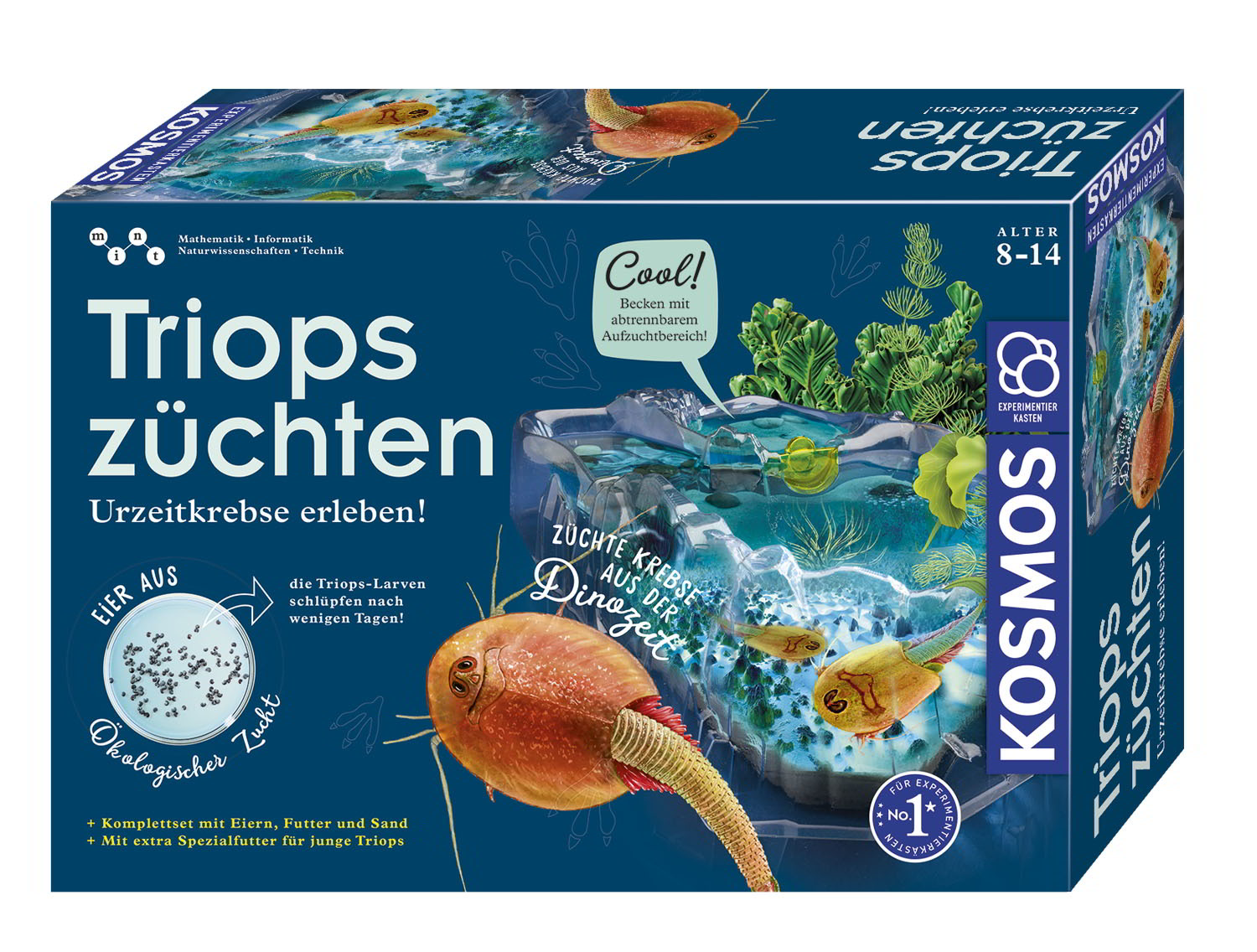Ezzel a KOSMOS kísérleti dobozzal a gyerekek maguk is tenyészthetik az őskori rákot, és részletesen megfigyelhetik a fejlődést a Triops tojástól a teljes kifejlett rákig. Az átlátszó, extra nagy medencének bejárata és elválasztható medencéje van. Ideális az állatok viselkedésének megfigyelésére és közel állnak hozzájuk, amikor felnőnek, kicserélik páncéljaikat, ásnak a homokba és tojásokat tojnak.