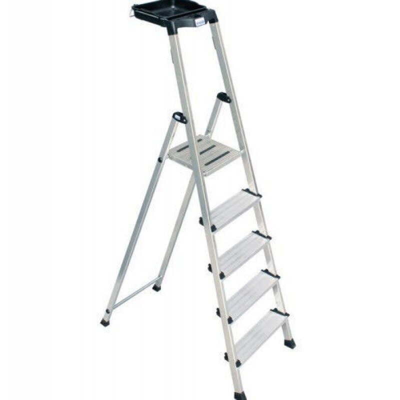 Praktikus és sokoldalú lépcsőfokos állólétra szinte korlátlan tárolási lehetőséggel, vödörtartóval és csúszásmentes dobogóval.