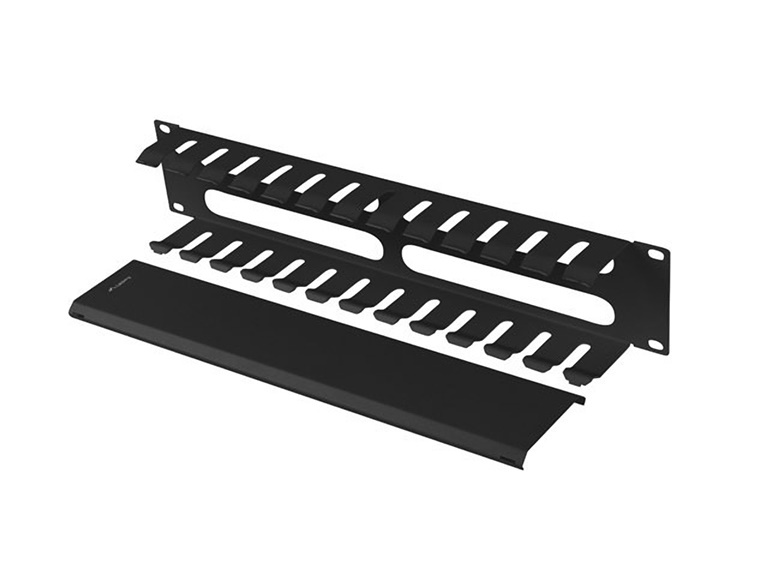 Kábelrendező 2U típusú Lanberg, 19"-os rack szekrényekhez. A kábelrendező kábelfuratokkal és dugóval van felszerelve.