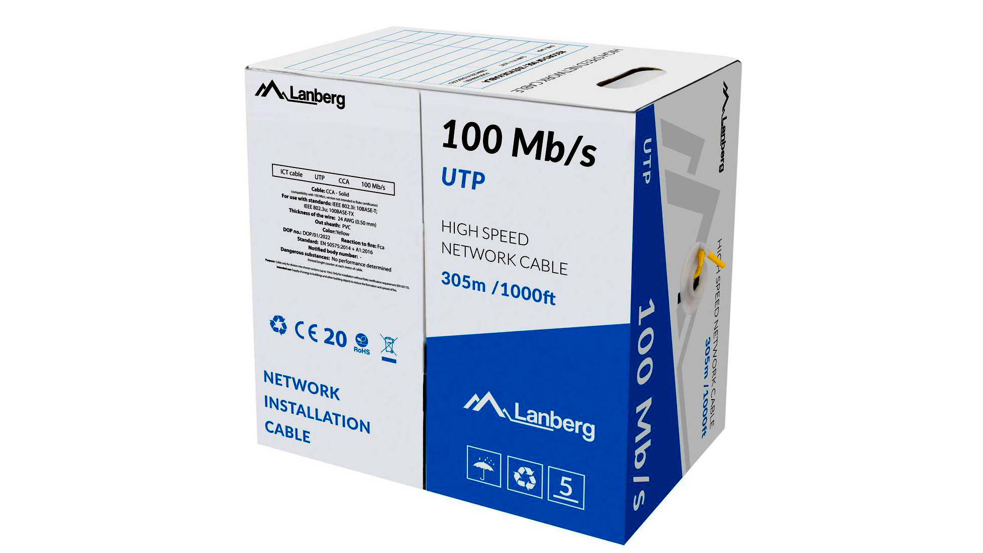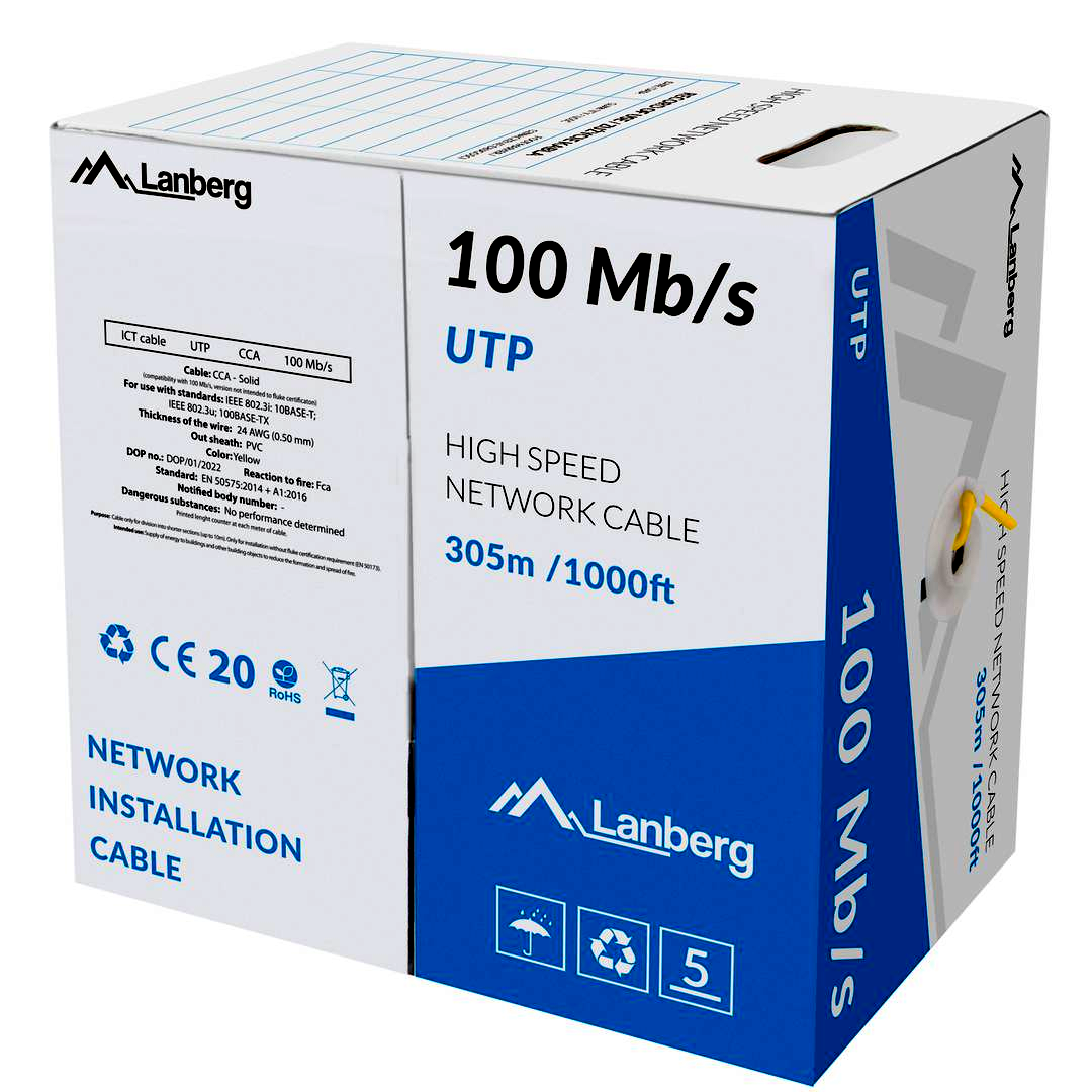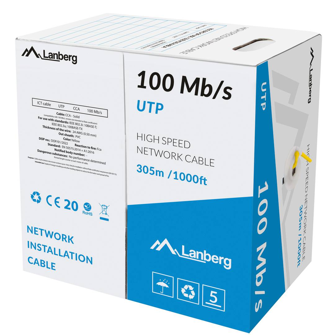 A Lanberg UTP CAT5e Patch kábel 305 méteres hosszával és a 0,50 mm átmérőjű vezetékekkel garantálja az optimális adatátvitelt akár 100 Mb/s sebességgel is. A kábel U/UTP árnyékolással rendelkezik, amely hatékonyan csökkenti az interferenciát, ezáltal növeli a jel tisztaságát és az adatátviteli távolságot.
