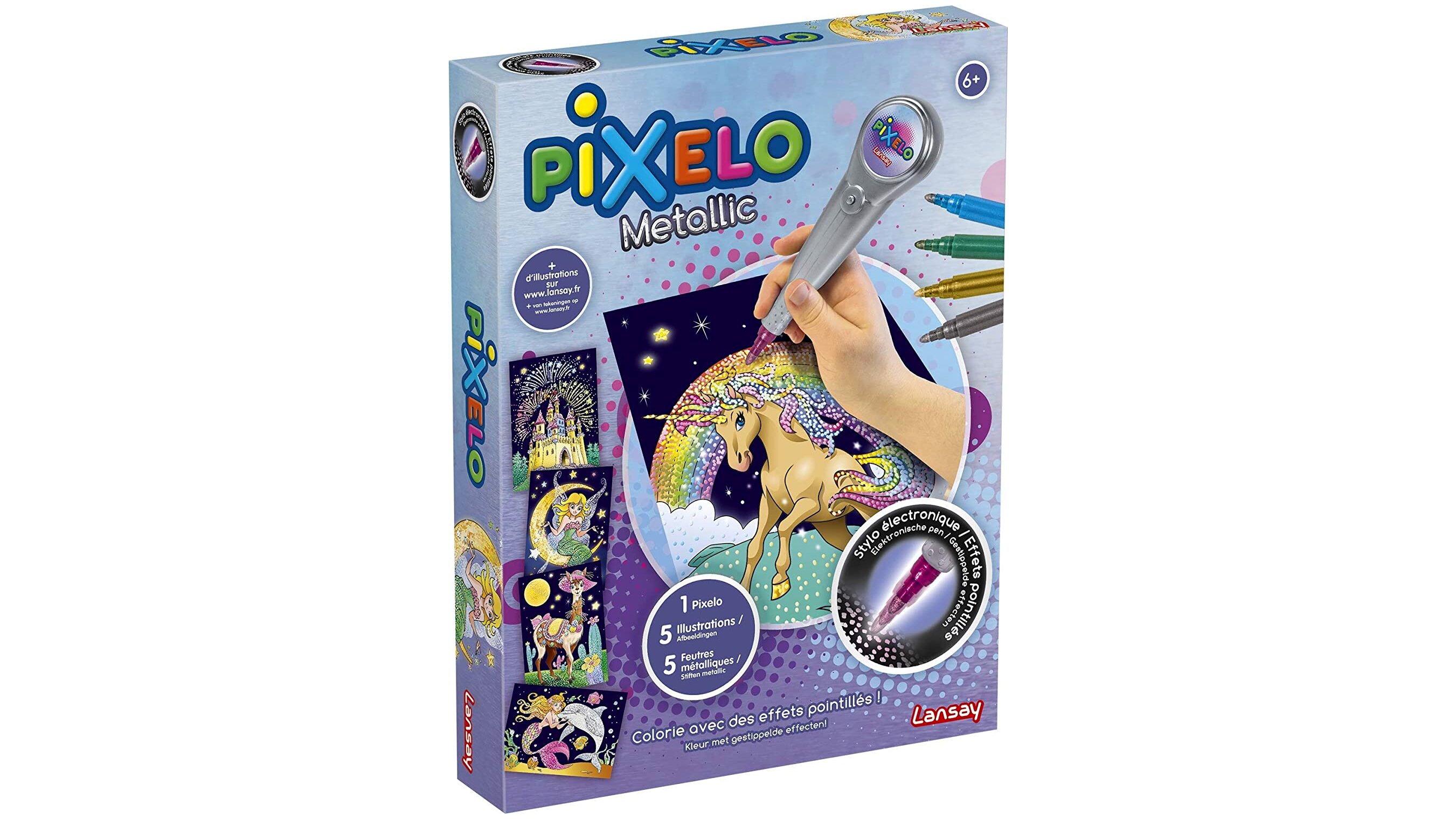 A Pixelo metál színekben pompázó készletével fényesen csillogó képeket készíthetnek a gyerekek pillanatok alatt. Ehhez szükségük lesz a Pixelo tollra és egy kiválasztott képre. Az elektronikus tollal pontozott mintákat készíthetnek, így szinte életre kelthetik az alkotást. A kiválasztott metál fényű filctollat bele kell helyezni a pontozóba, ami automatikusan kitölti a képet. A gyerekek többféle illúziót is elkészíthetnek a csomagnak köszönhetően.