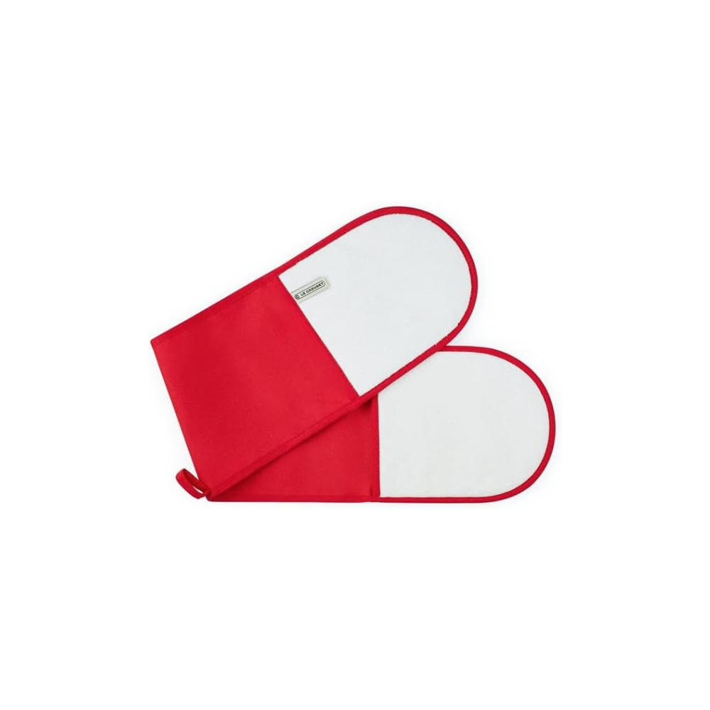 A Le Creuset Dupla Sütőkesztyű kialakítása extra védelmet nyújt mindkét kéz, a kar oldala és a has számára. A pamutvászon anyag kényelmes viselet, és a kesztyű könnyedén akasztható a sütő sínjére vagy egy hurokra, így mindig kéznél lesz.