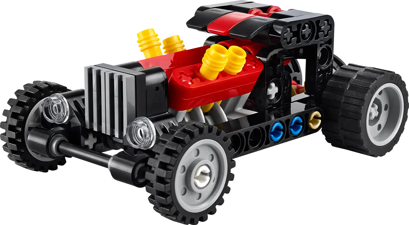 Ez a LEGO® Technic készlet kifejezetten azoknak szól, akik nem csak a külsőt, hanem a technikát is imádják. A modell egyik legizgalmasabb eleme a működő motor, amelyben láthatóan mozognak a dugattyúk, amikor a járművet tolják. A széles, masszív gumiabroncsok és az erőteljes kiállás hitelesen adják vissza a hot rod autók jellegzetes, „izomautós” hangulatát.