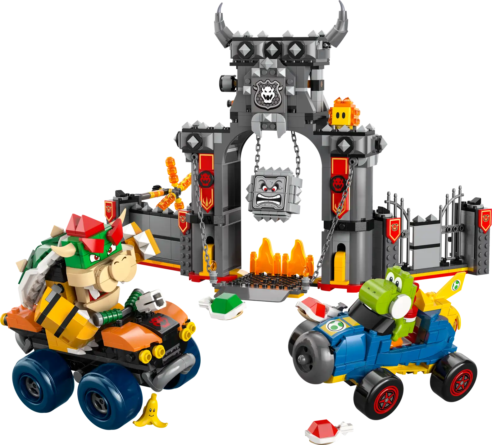 • A Mario Kart széria 1992 óta az egyik legkedveltebb versenyjáték, és ez a készlet vizuálisan is hűen hozza a játék világát: láva, kastély, tűz, kőblokkok, páncélok, banánok.