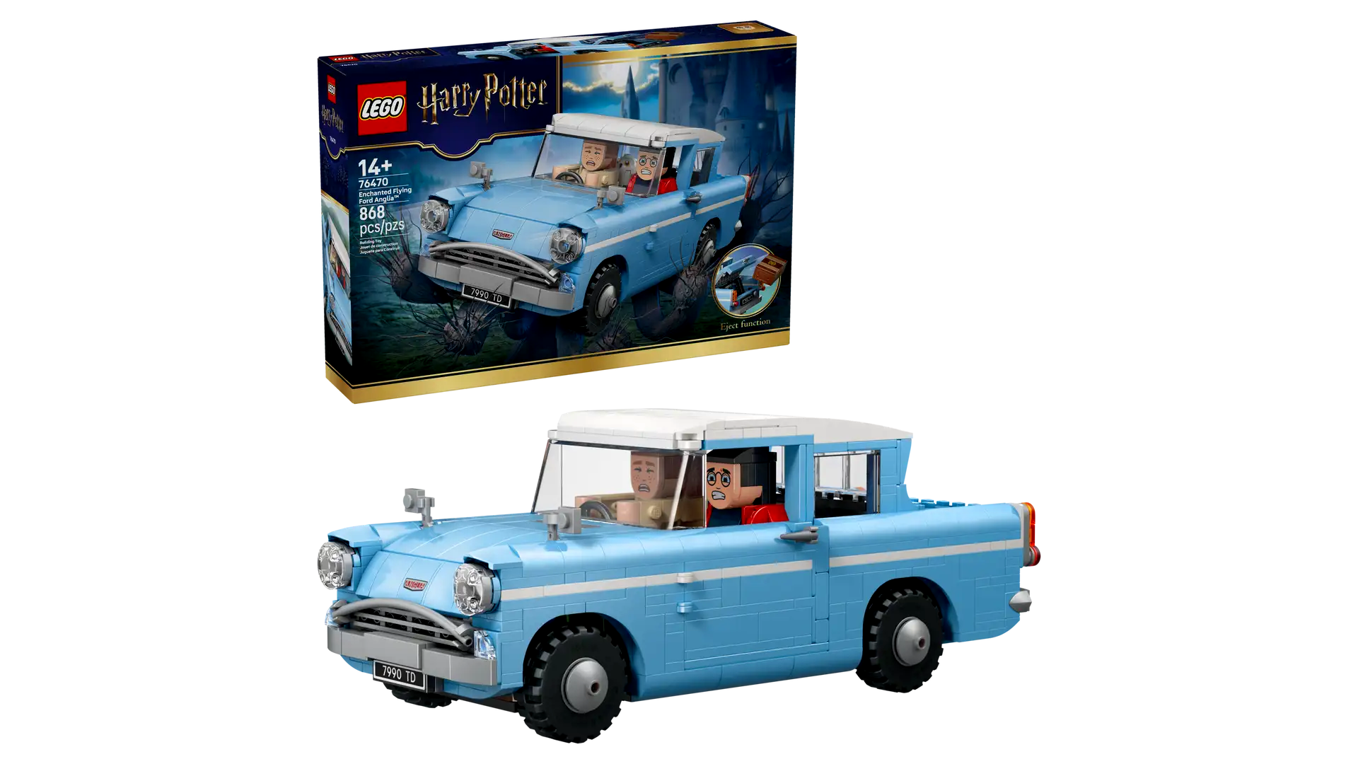 A készletben található megépíthető autó a híres, elvarázsolt kék Ford Anglia jellegzetes formáját és arányait idézi. A gondosan kialakított külső és belső dizájn, a jellegzetes tetővonal, a krómozott hatású elemek és az átlátszó elemekből épült lámpák mind az ikonikus filmjármű hangulatát adják vissza. A modell méreteinek köszönhetően tökéletesen mutat polcon, vitrinen vagy íróasztalon is.