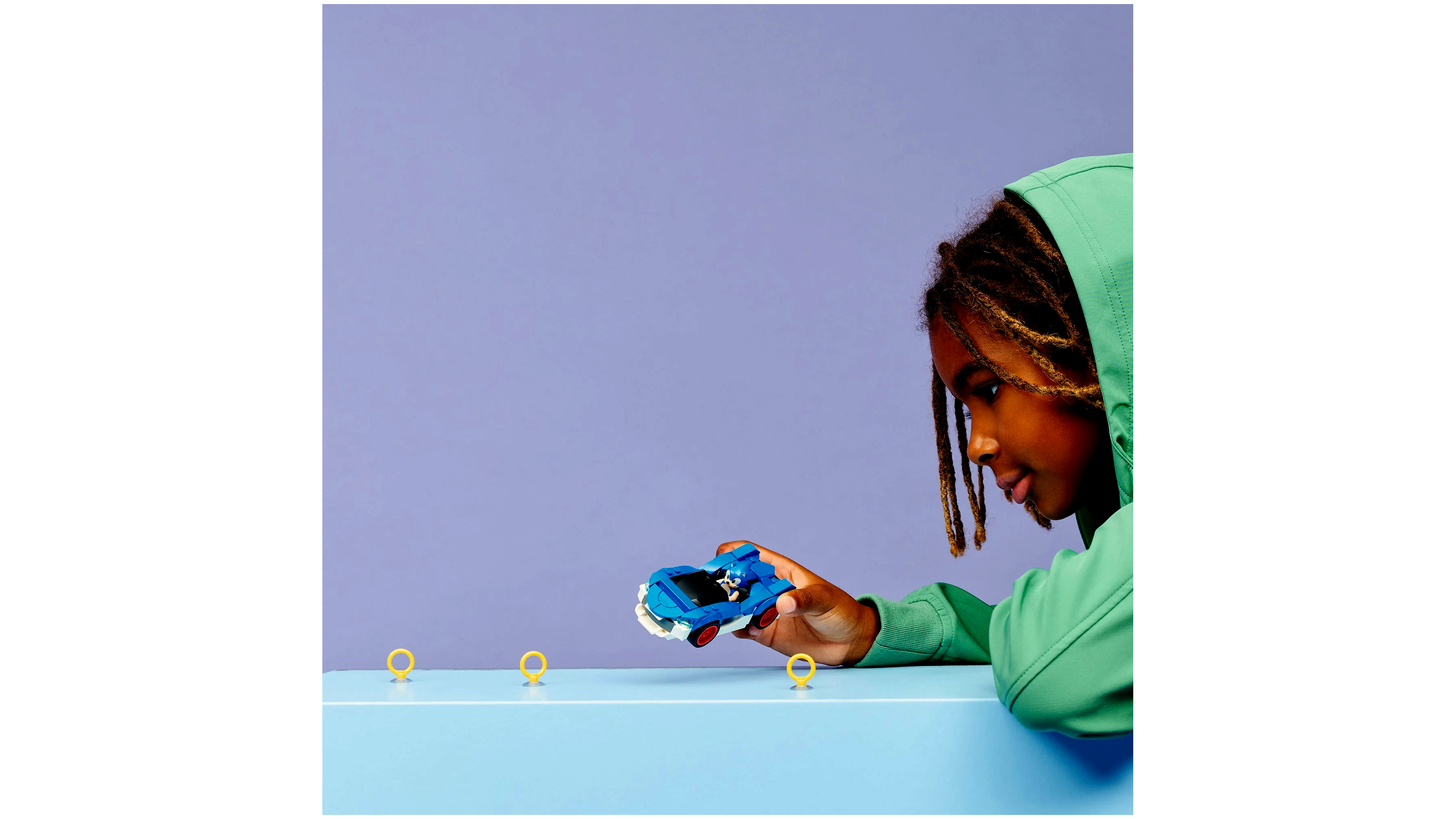 A szett központi eleme a kék-fehér, sportos versenyautó piros felnikkel, amely tökéletesen illik a villámgyors hős stílusához. A huncut arckifejezésű Sonic minifigura beültethető a cockpitbe, így a gyerekek azonnal kezdhetik a száguldást, miközben Aranygyűrűket gyűjtenek, akadályokat kerülnek ki, és újraalkotják a videojáték ikonikus pillanatait.
