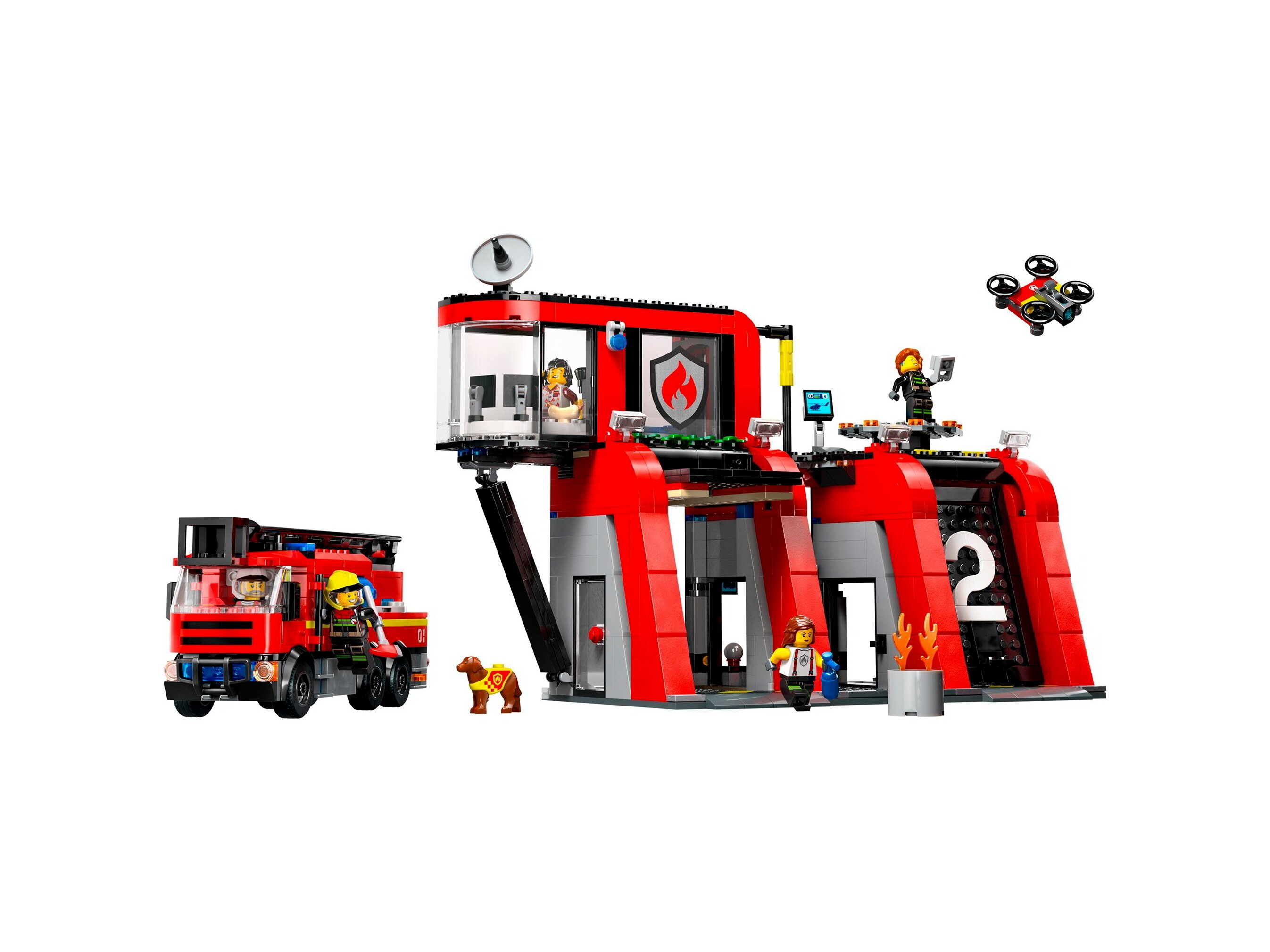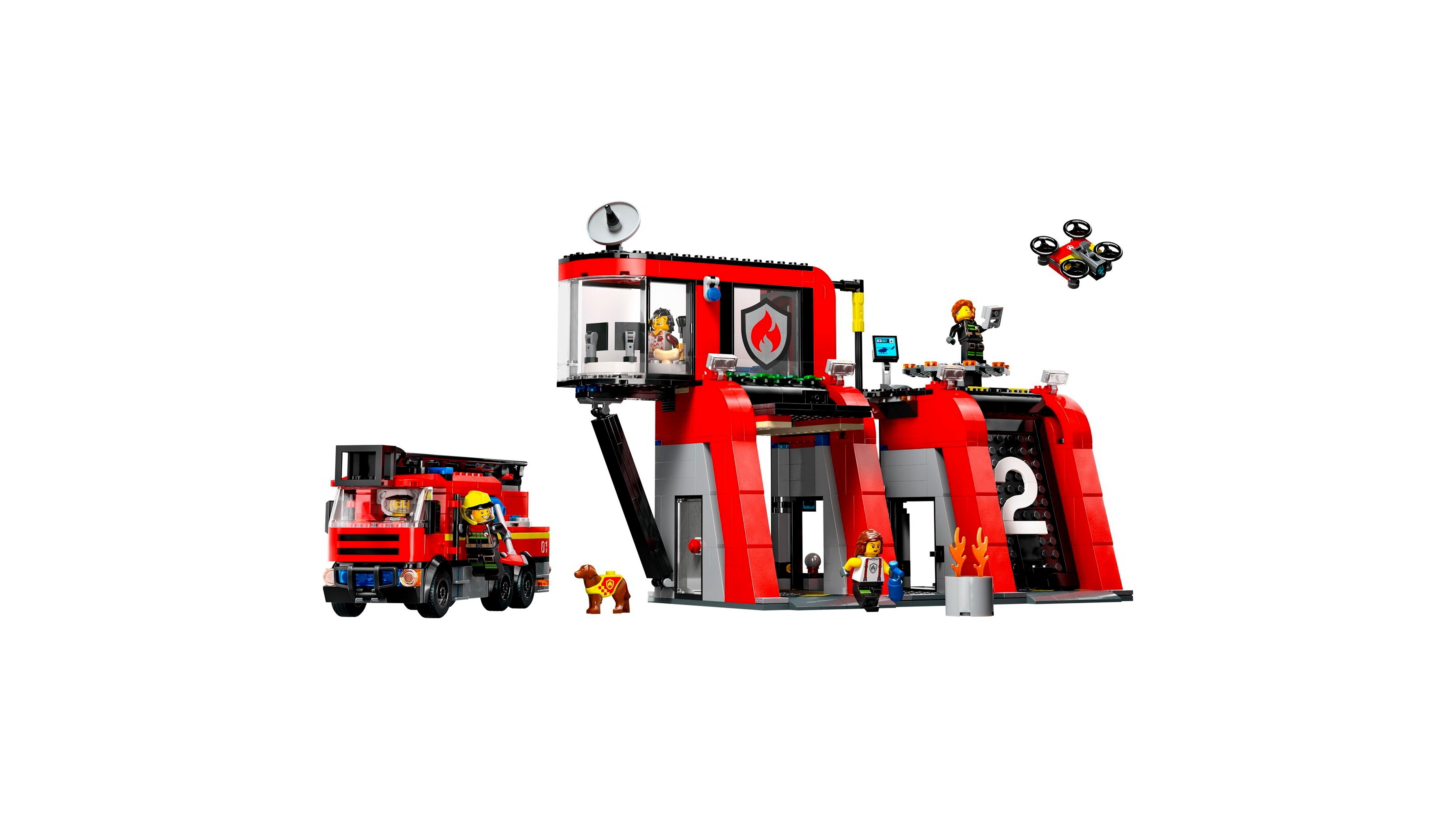 Az állomáson modern irányítóközpont, konyhasarok és hálóhelyiségek is találhatók az eszköztároló terület felett, valamint 2 garázs magas billenőajtókkal. A készlet tartalmaz még egy játék drónt és egy menő tűzoltóautót moduláris létrával és tűzoltó készülékekkel. Mozgósítsd az 5 tűzoltó-minifigurát és a tűzoltó kutya figurát az akciódús tűzoltó szerepjátékhoz. A gyerekek használhatják a készletet a LEGO City termékcsalád többi (külön megvásárolható) termékével a még nagyobb kalandokhoz!