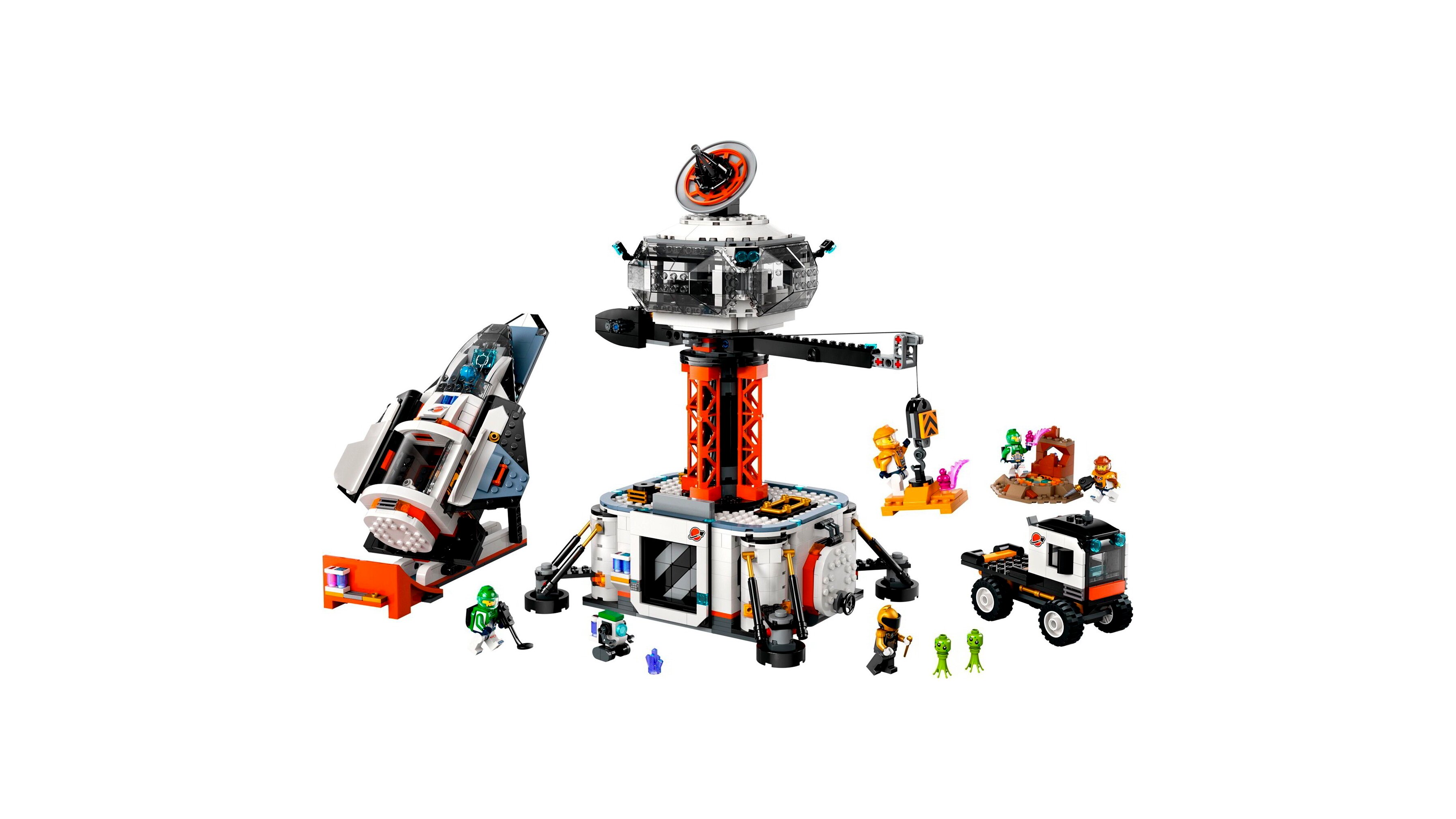 Az Űrbázis és rakétakilövő űrkutató játék tele van funkciókkal az e világon kívüli kalandokhoz. A fő szektor felett egy vezérlőterem és egy 360°-os űrdaru torony található, amelyből a kör alakú felszereléstároló, a tudományos labor és a pihenő terület érhető el. A készlet tartalmaz még egy űrhajót, egy kilövőállást, egy járművet építkezéshez, kivitelezéshez és egy bolygójelenetet játék energiakristályokkal és növényzettel, valamint 6 űrlegénységi minifigurát, 1 robotot és 2 földönkívüli figurát az ötletes szerepjátékhoz.