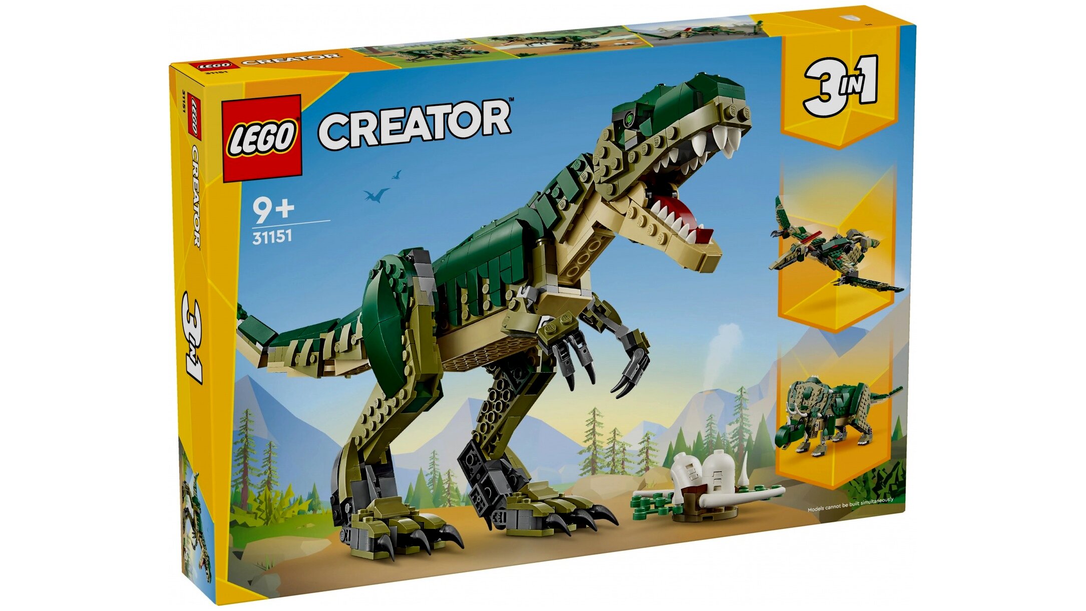 Ez a 626 elemből álló szett tartalmazza a lenyűgözően megépíthető játék Tyrannosaurus rexet, melynek magassága 15 cm. A LEGO Creator 3 az 1-ben szettek tökéletes választást nyújtanak további építési lehetőségekkel, beleértve menő járműveket, állatokat és különleges űrhajósokat is - külön kaphatók.