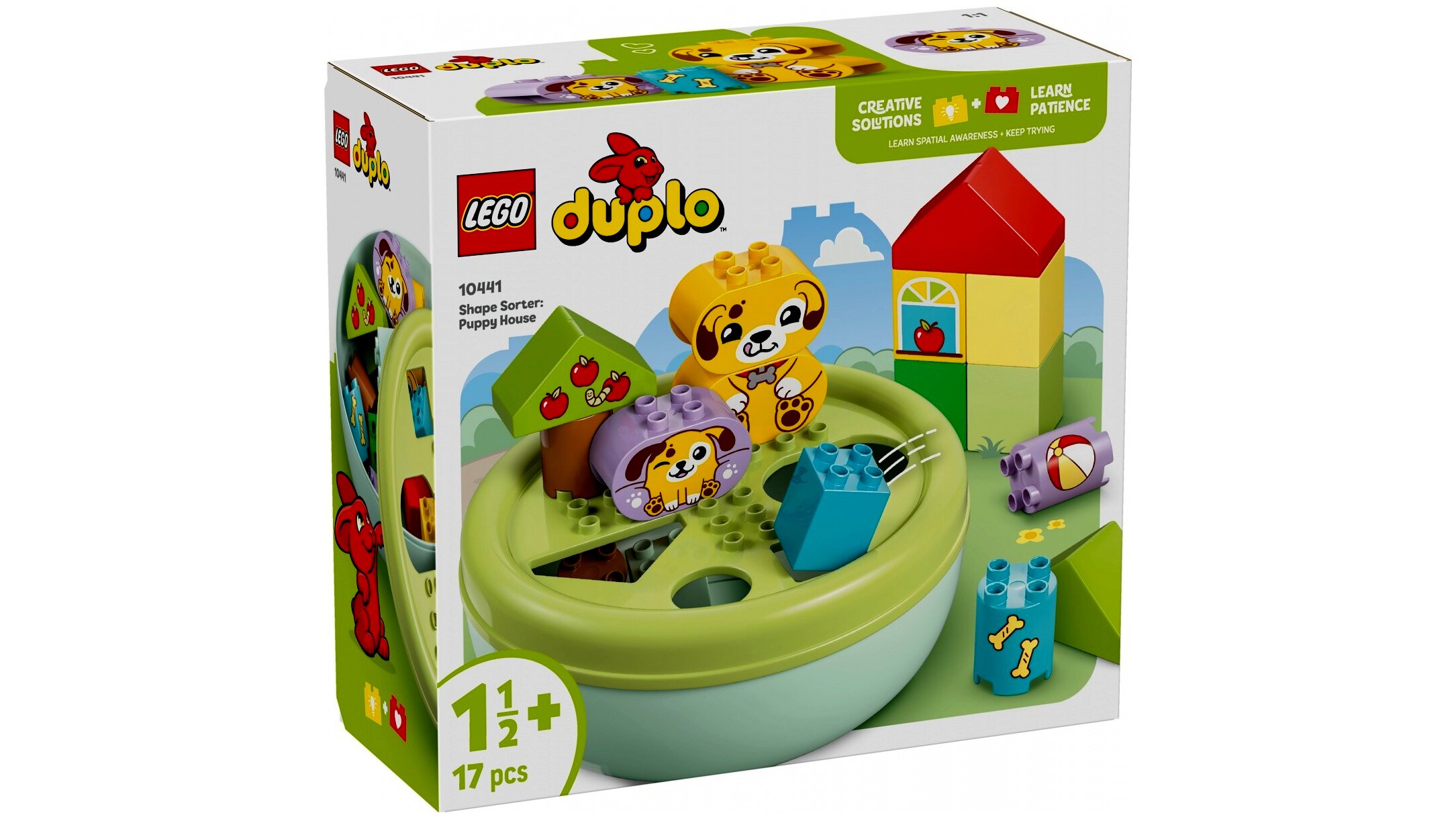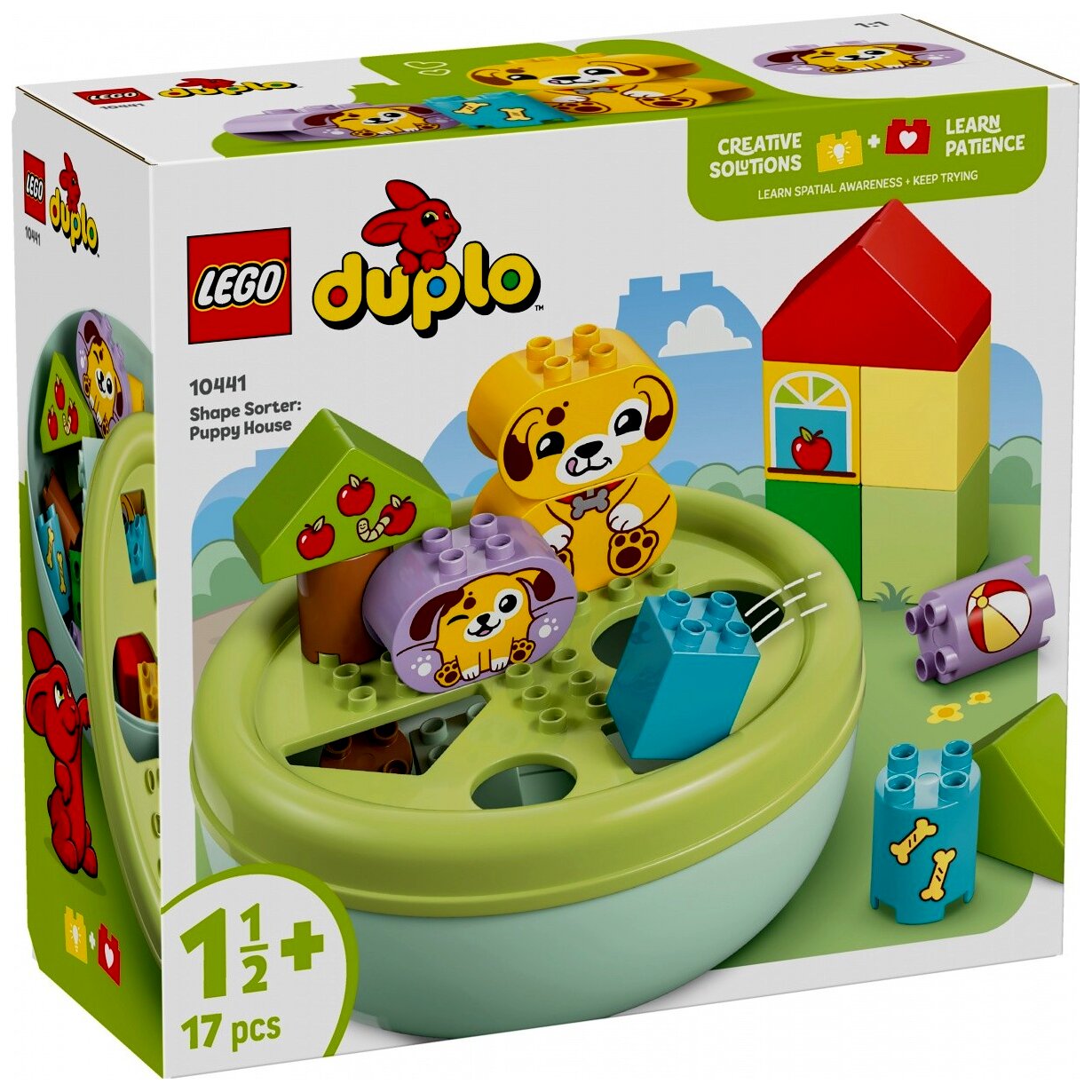 Ez a térérzékelésre fókuszáló kisgyermekjáték rengeteg vidám családi tevékenységet rejt magában. A szülők segíthetnek a különféle formák felismerésében és megnevezésében, miközben a gyerekek élvezik a fákat, a kutyafigurákat vagy éppen a ház építését. Akár történeteket is eljátszhatnak a cuki LEGO® DUPLO® játék kutyusokkal, labdázhatnak velük, vagy csontot adhatnak nekik.