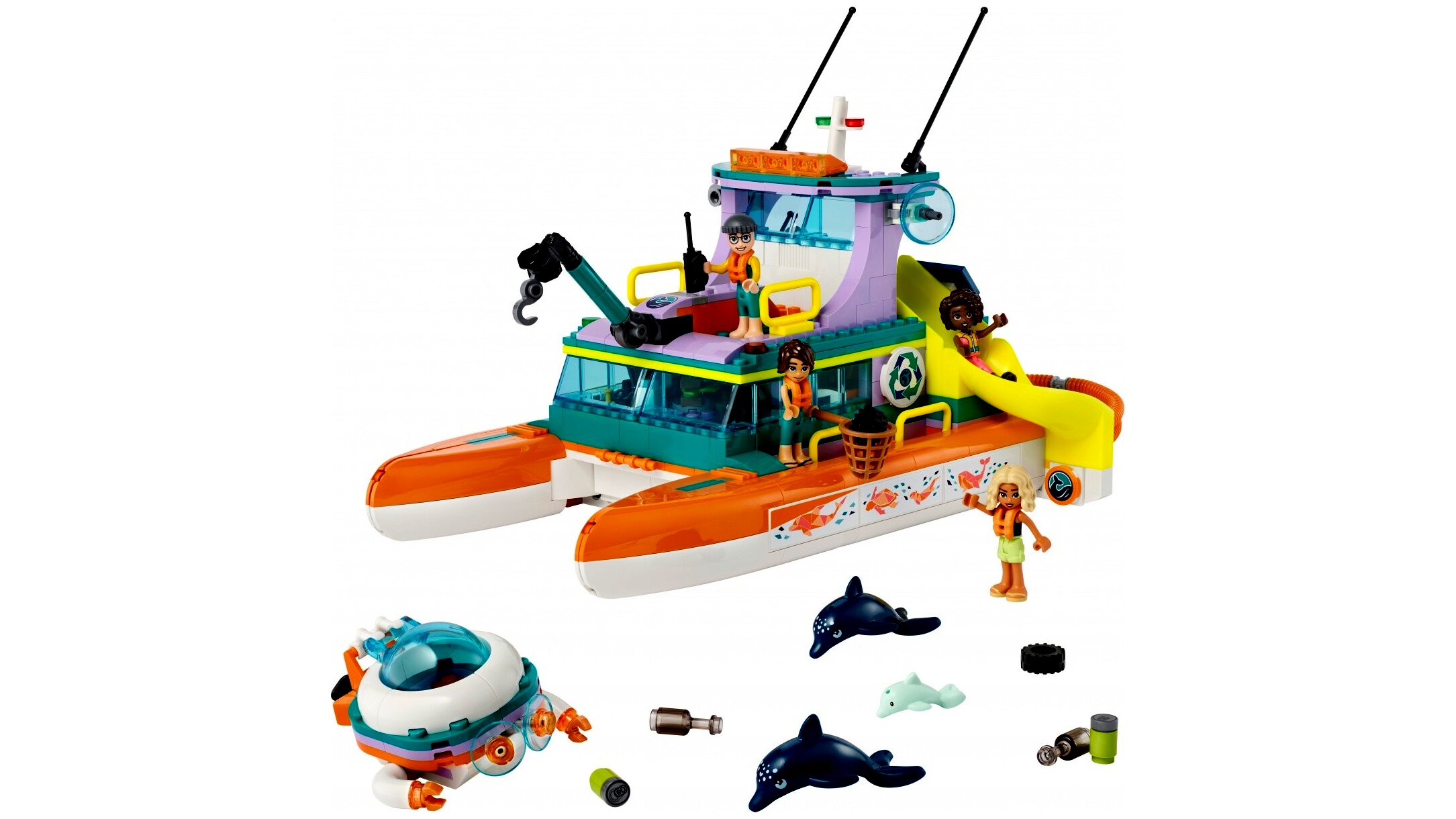 A természet iránt érdeklődő gyerekek sokat tanulhatnak a tengeri életről ezzel a 7 éves kortól ajánlott, részletgazdag LEGO® Friends Tengeri mentőhajó építőjáték-készlettel. A szett egy megépíthető katamaránt tartalmaz, ami laboratóriumként is használható, emellett egy kis tengeralattjáró is vár rád. A gyerekek tengeri mentőakciókat játszhatnak el, miközben a szemét fölé gurítják a hajót, hogy belesöpörjék azt a hálóba, és készen álljon az újrahasznosításra. Nova és Aliya nem gondolták, hogy túl sok közös lenne bennük, de ezen a kalandon közelebb kerülnek egymáshoz.