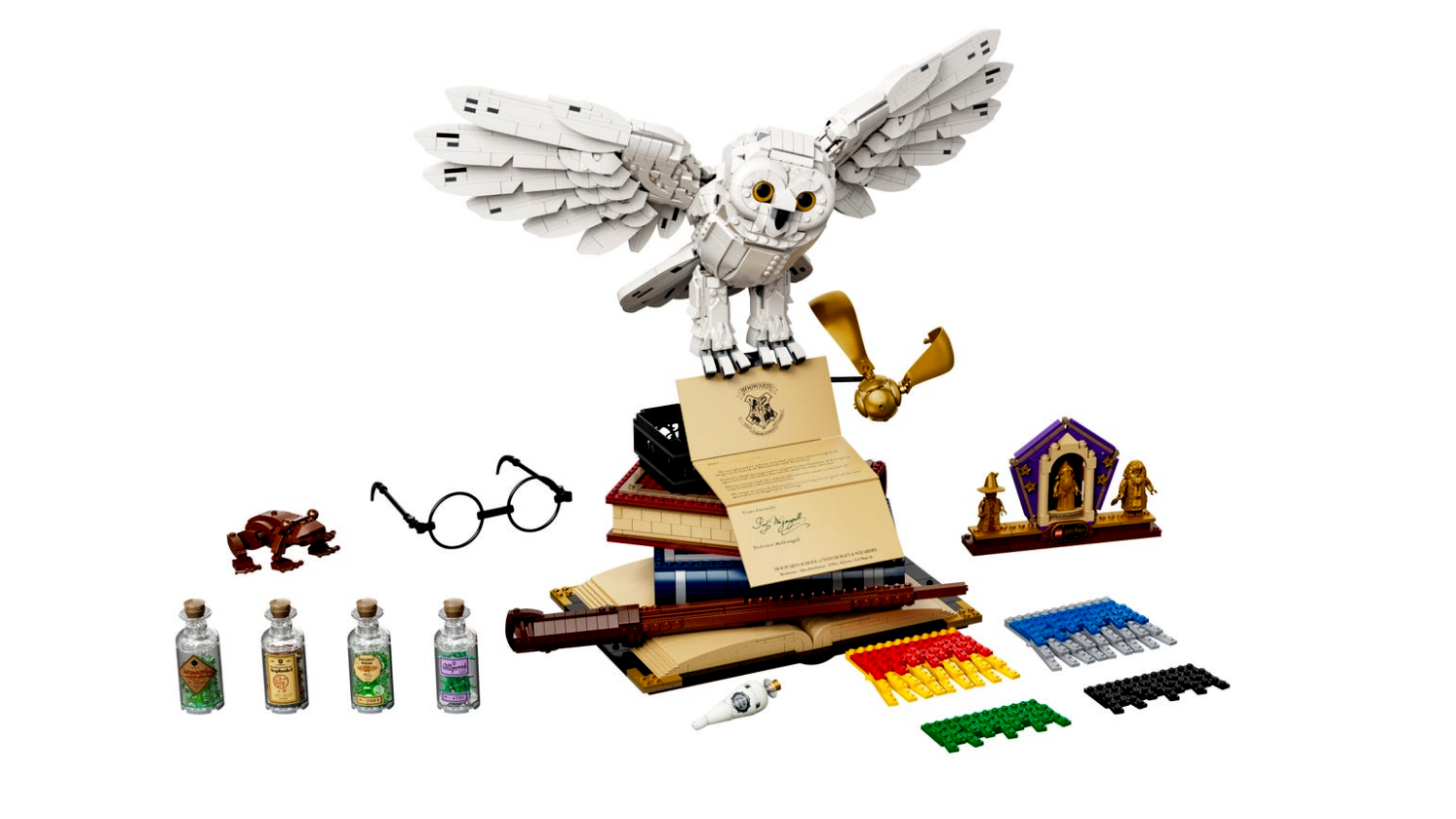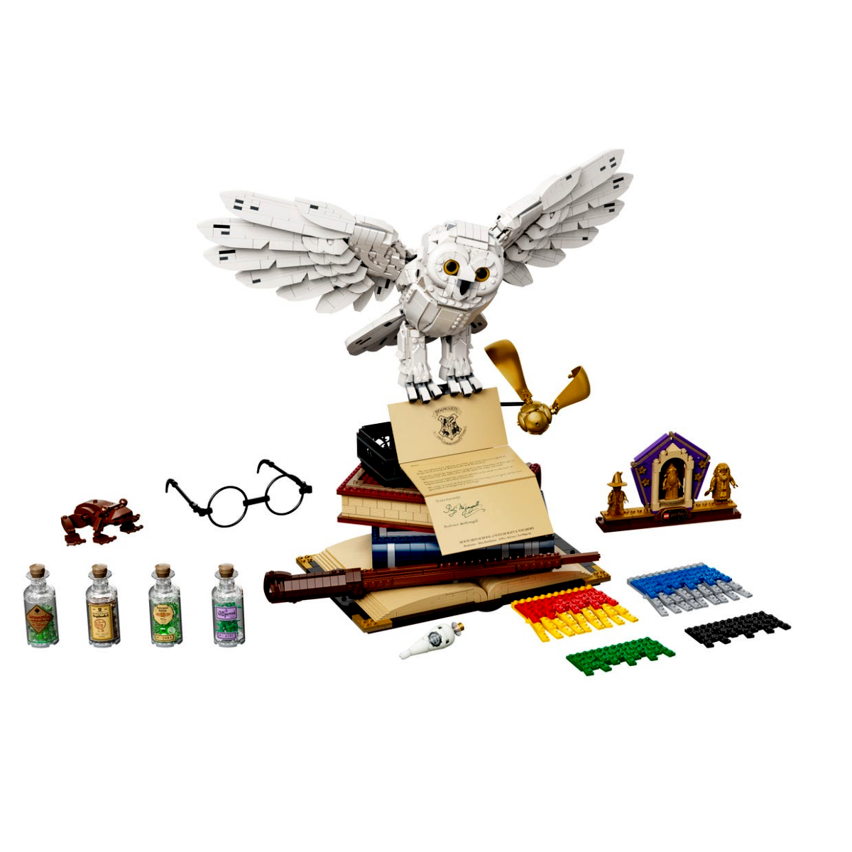 A varázslatos építmény tetején a szeretett Hedvig bagoly ül, miközben egy áhított roxforti meghívót tart magánál. Ez az egyedülálló modell 3 exkluzív aranyszínű minifigurát tartalmaz: Albus Dumbledore, Minerva McGalagony és Rubeus Hagrid, valamint egy díszített csempével ellátott bemutatóállvány a LEGO Harry Potter elmúlt 20 évének megünneplésére.