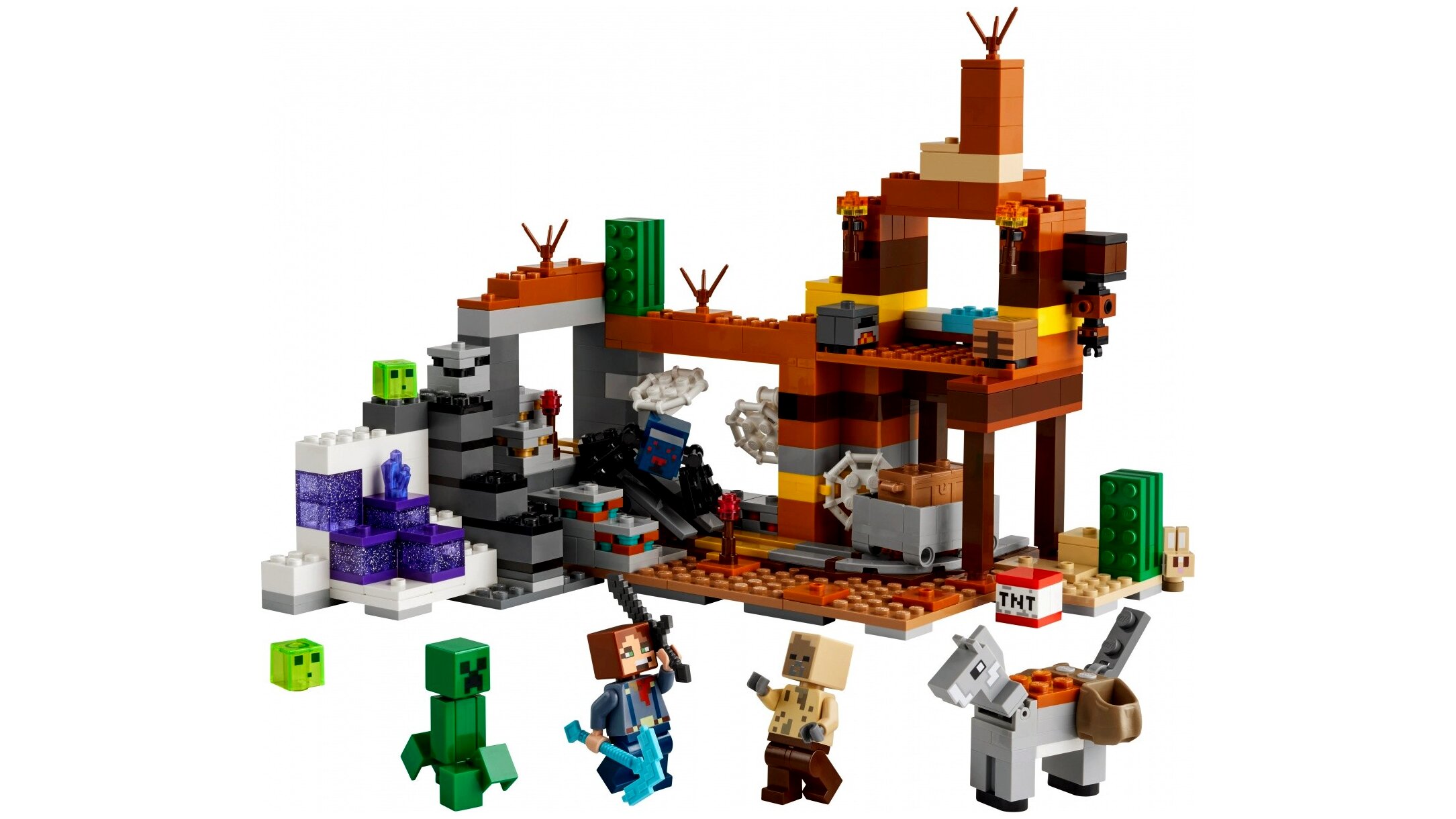 Ez az építőjáték számos népszerű Minecraft® mobfigurát tartalmaz, mint például a pusztasági felfedezőt, egy Creeper™-t, egy bányapókot, egy huskot, egy bébi nyuszit, egy szamarat két nyeregtáskával, két nyálkát és egy denevért, amely szárnyaival fejjel lefelé is tud lógni. A pusztabiom elhagyatott bányájában a gyerekek TNT-t helyezhetnek a kövek közé, és a robbantás funkcióval értékes ércet találhatnak, mint a réz, arany, vöröskő és ametisztkristály.
