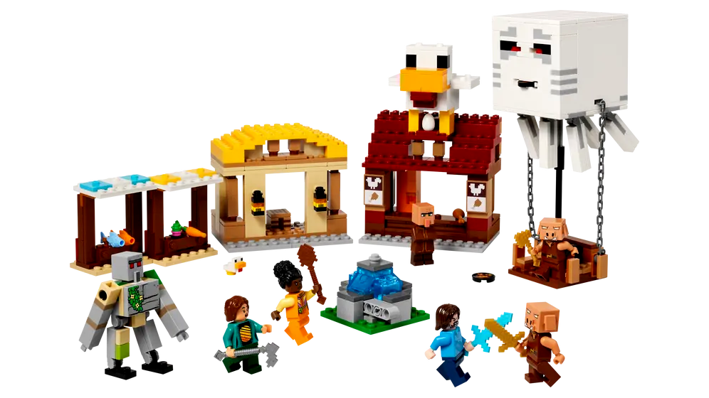A dobozban megtalálhatóak a kedvenc Minecraft szereplőid, beleértve Steve-et, Natalie-t, Dawnt és egy falusit. A készlet tartalmaz továbbá egy szellemléghajót, 2 malackát, egy kiscsirkét és egy beállítható vasgólemfigura. A léghajóban található egy korongvető, amely még izgalmasabbá teszi a játékot, míg a falusi jelenet piaci pultokkal, egy Steve-féle sült csirkét árusító étteremmel, barkácskunyhóval és szökőkúttal van felszerelve.