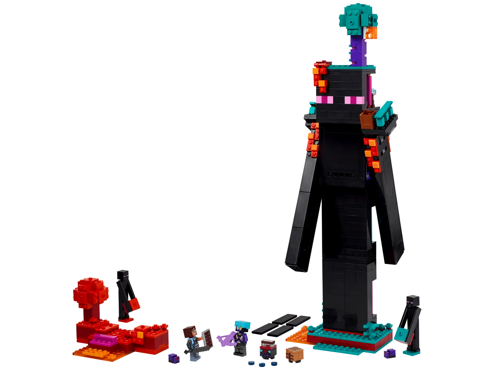 A Minecraft® videojátékot életre keltő LEGO® Minecraft építőjátékok kiválóan illusztrálják a videójáték mobjait, helyszíneit és funkcióit, a LEGO kockák kézzelfogható kreativitása segítségével. A játékosok különféle módokon élvezhetik az építést és a játékot e sokoldalú szettel. A Bevégzőtorony elsődleges építménye fejében az alvilágportállal, mindkét vállán erkéllyel és két helyiséggel, barkácsasztállal, bűvölőasztallal és tárolóval, ahol a bevégzőgyöngyök tárolhatók. A kalandok során a mocsaras és a karmazsin erdő biomok elemei is életre kelnek, gazdagítva a játékélményt.