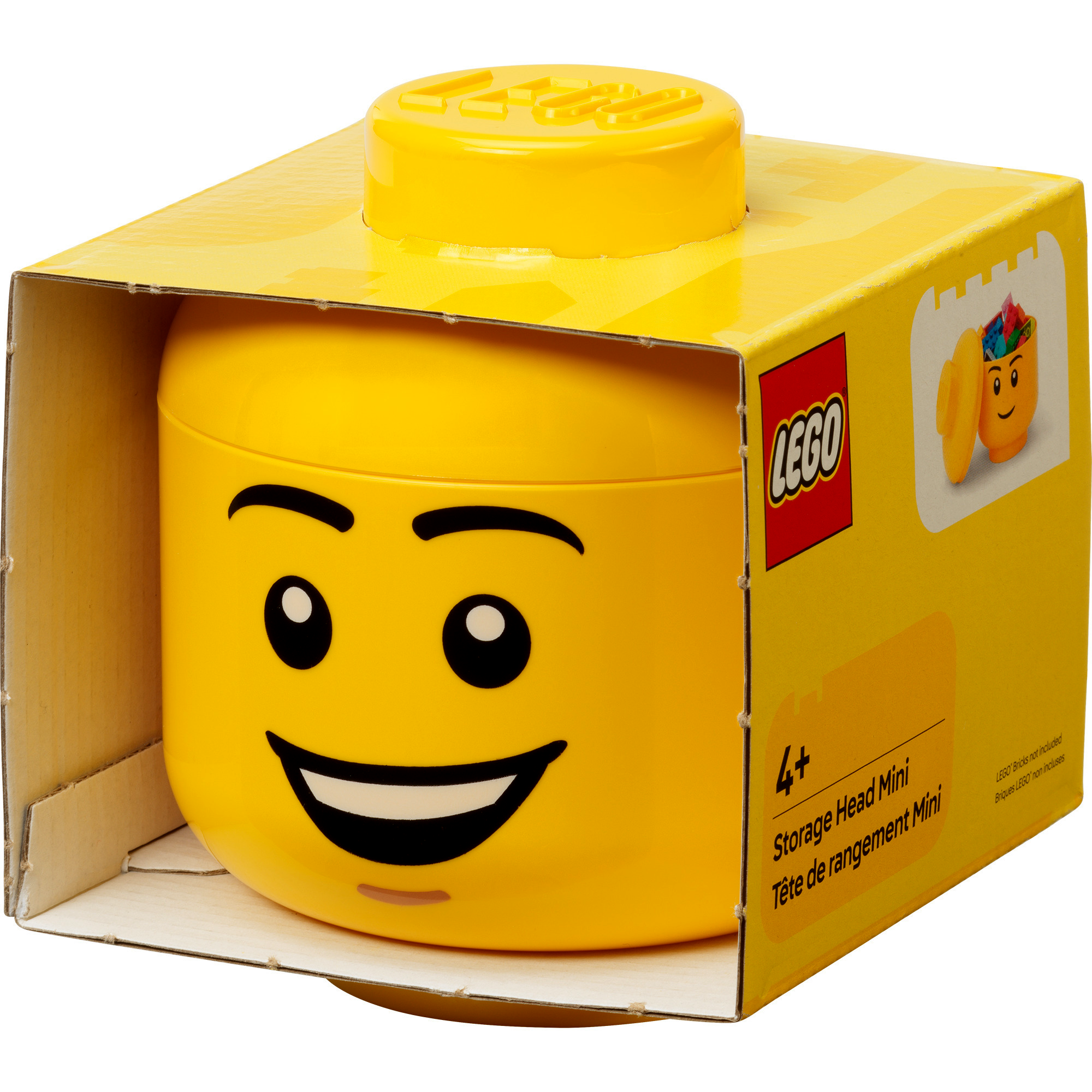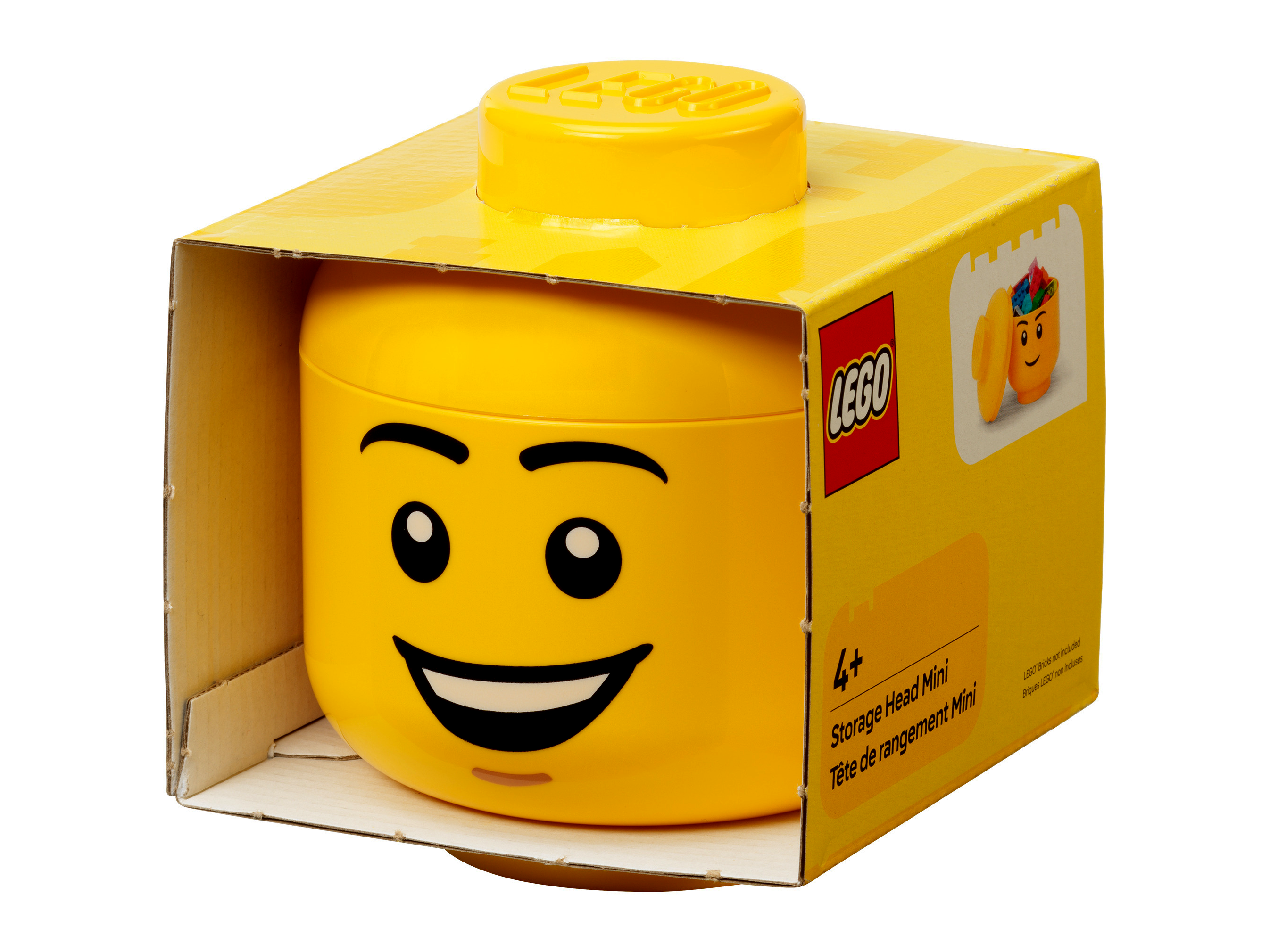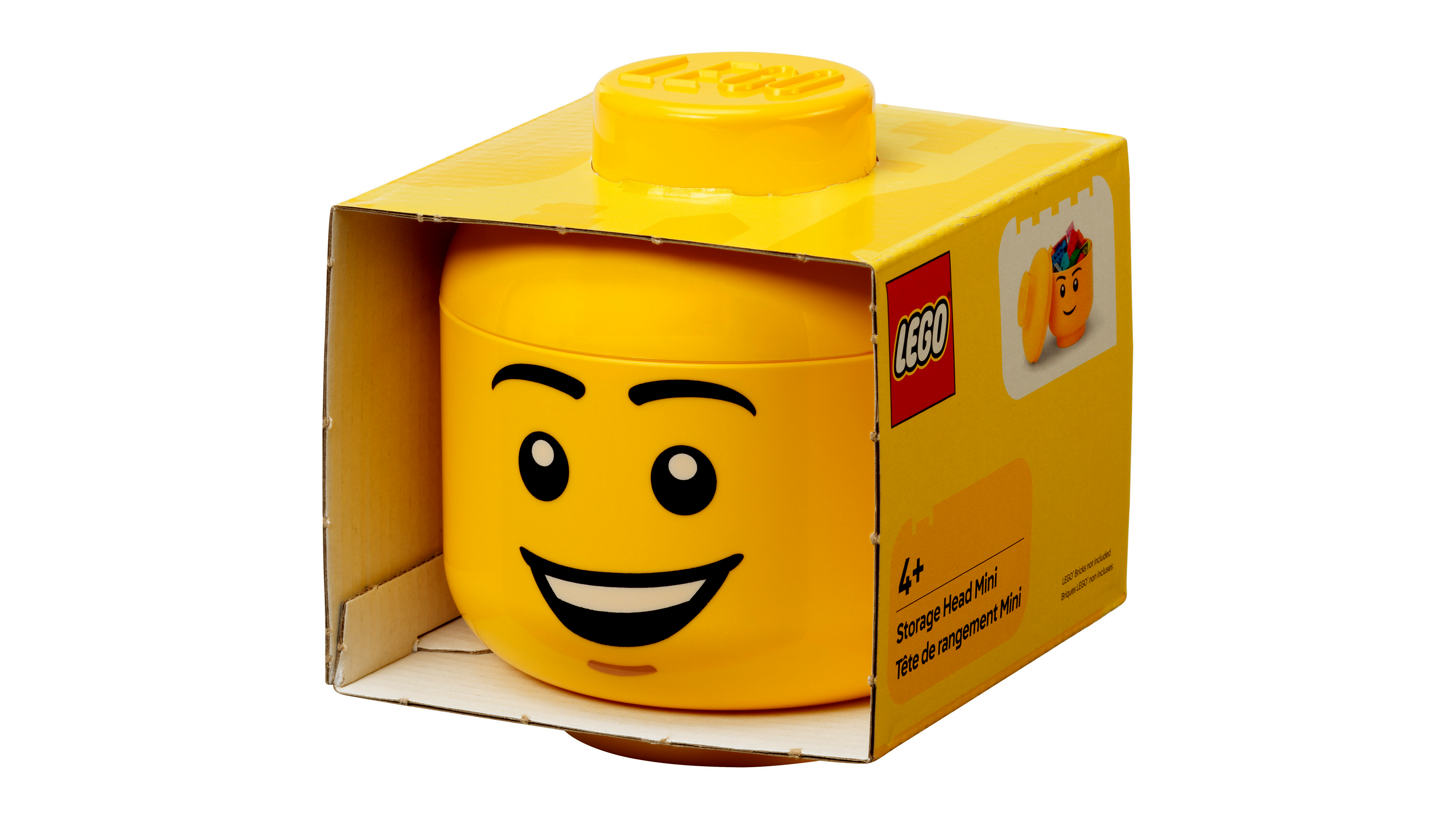 Ez a mosolygós tárolófej egyszerre játékos lakásdekoráció és praktikus rendszerező megoldás. A jól ismert minifigura-fej formának köszönhetően azonnal felismerhető, miközben belül elegendő helyet kínál apróbb tárgyak, LEGO elemek vagy más kincsek tárolására.