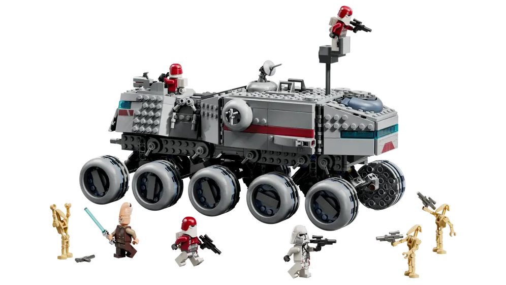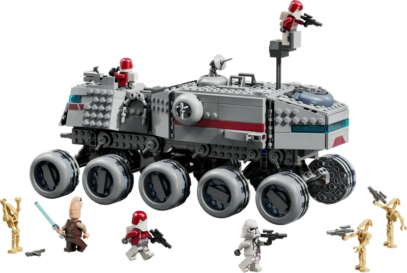 A készlet egy lenyűgöző, több részletében nyitható páncélozott tankot tartalmaz, amely ideális nagyszabású klónháborús ütközetekhez. A külső rész robusztus, harci járművekre emlékeztető formákat kapott, míg a belső tér tele van játéklehetőségekkel, ülésekkel és taktikai zónákkal a klónkatonák számára.